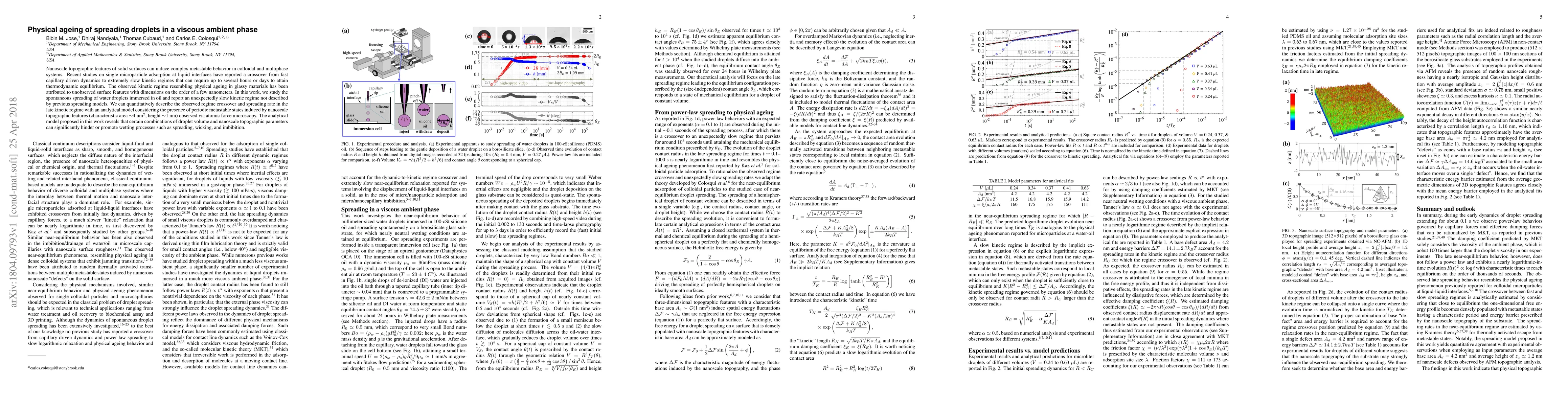 Nanoscale topographic features of solid surfaces can induce complex metastable behavior in colloidal and multiphase systems. Recent studies on single microparticle adsorption at liquid interfaces have reported a crossover from fast capillary driven dynamics to extremely slow kinetic regimes that can require up to several hours or days to attain thermodynamic equilibrium. The observed kinetic regime resembling physical ageing in glassy materials has been attributed to unobserved surface features with dimensions on the order of a few nanometers. In this work, we study the spontaneous spreading of water droplets immersed in oil and report an unexpectedly slow kinetic regime not described by previous spreading models. We can quantitatively describe the observed regime crossover and spreading rate in the late kinetic regime with an analytical model considering the presence of periodic metastable states induced by nanoscale topographic features (characteristic area ~4 nm^2, height ~1 nm) observed via atomic force microscopy. The analytical model proposed in this work reveals that certain combinations of droplet volume and nanoscale topographic parameters can significantly hinder or promote wetting processes such as spreading, wicking, and imbibition.