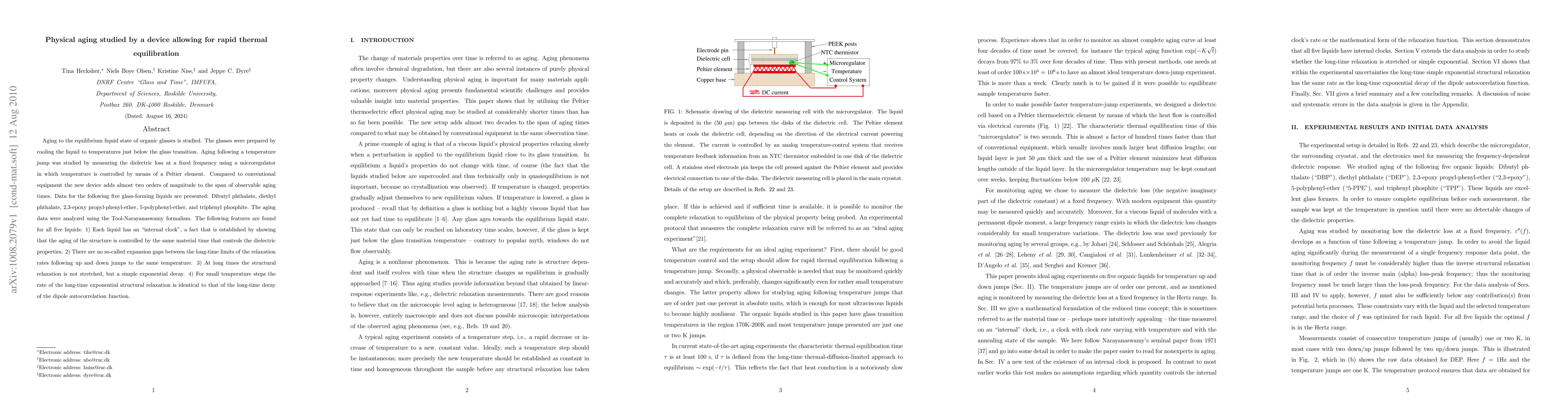 Aging to the equilibrium liquid state of organic glasses is studied. The glasses were prepared by cooling the liquid to temperatures just below the glass transition. Aging following a temperature jump was studied by measuring the dielectric loss at a fixed frequency using a microregulator in which temperature is controlled by means of a Peltier element. Compared to conventional equipment the new device adds almost two orders of magnitude to the span of observable aging times. Data for the following five glass-forming liquids are presented: Dibutyl phthalate, diethyl phthalate, 2,3-epoxy propyl-phenyl-ether, 5-polyphenyl-ether, and triphenyl phosphite. The aging data were analyzed using the Tool-Narayanaswamy formalism. The following features are found for all five liquids: 1) Each liquid has an "internal clock", a fact that is established by showing that the aging of the structure is controlled by the same material time that controls the dielectric properties. 2) There are no so-called expansion gaps between the long-time limits of the relaxation rates following up and down jumps to the same temperature. 3) At long times the structural relaxation is not stretched, but a simple exponential decay. 4) For small temperature steps the rate of the long-time exponential structural relaxation is identical to that of the long-time decay of the dipole autocorrelation function.