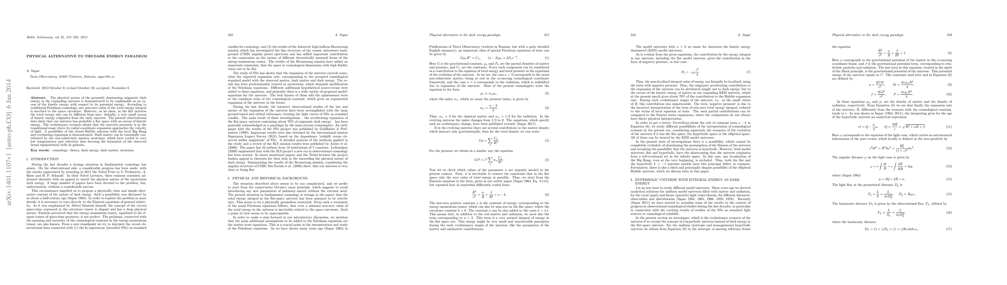 The physical nature of the presently dominating enigmatic dark energy in the expanding universe is demonstrated to be explainable as an excess of the kinetic energy with respect to its potential energy. According to traditional Friedman cosmology, any non-zero value of the total energy integral is ascribed to the space curvature. However, as we show, in the flat universe the total energy also can be different from zero. Initially, a very small excess of kinetic energy originates from the early universe. The present observational data show that our universe has probably a flat space with an excess of kinetic energy. The evolutionary scenario shows that the universe presently is in the transitional stage where its radial coordinate expansion approaches the velocity of light. A possibility of the closed Bubble universe with the local Big Bang and everlasting expansion is demonstrated. Dark matter can be essentially contributed by the non-relativistic massive neutrinos, which have cooled to very low temperatures and velocities thus favoring the formation of the observed broad equipotential wells in galaxies.