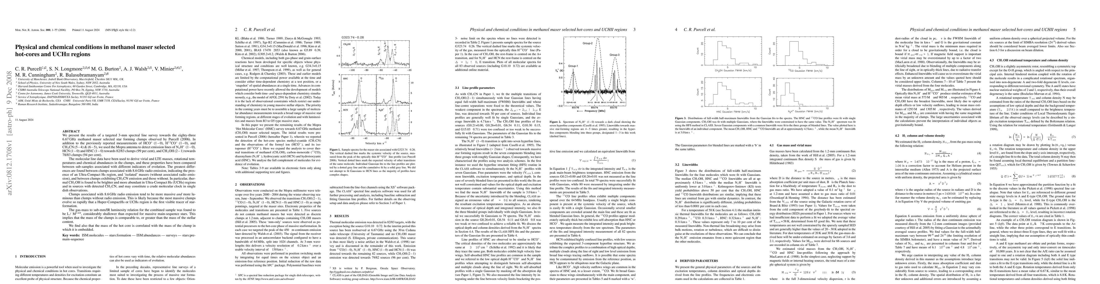 We present the results of a targeted 3-mm spectral line survey towards the eighty-three 6.67 GHz methanol maser selected star forming clumps observed by Purcell et al. 2006. In addition to the previously reported measurements of HCO+ (1 - 0), H13CO+ (1 - 0), and CH3CN (5 - 4) & (6 -5), we used the Mopra antenna to detect emission lines of N2H+ (1 - 0), HCN (1 - 0) and HNC (1 - 0) towards 82/83 clumps (99 per cent), and CH3OH (2 - 1) towards 78/83 clumps (94 per cent). The molecular line data have been used to derive virial and LTE masses, rotational temperatures and chemical abundances in the clumps, and these properties have been compared between sub-samples associated with different indicators of evolution. The greatest differences are found between clumps associated with 8.6 GHz radio emission, indicating the presence of an Ultra-Compact HII region, and `isolated' masers (without associated radio emission), and between clumps exhibiting CH3CN emission and those without. In particular, thermal CH3OH is found to be brighter and more abundant in Ultra-Compact HII (UCHII) regions and in sources with detected CH3CN, and may constitute a crude molecular clock in single dish observations. Clumps associated with 8.6 GHz radio emission tend to be more massive and more luminous than clumps without radio emission. This is likely because the most massive clumps evolve so rapidly that a Hyper-Compact HII or UCHII region is the first visible tracer of star-formation. The gas-mass to sub-mm/IR luminosity relation for the combined sample was found to be L proportional to M**0.68, considerably shallower than expected for massive main-sequence stars.