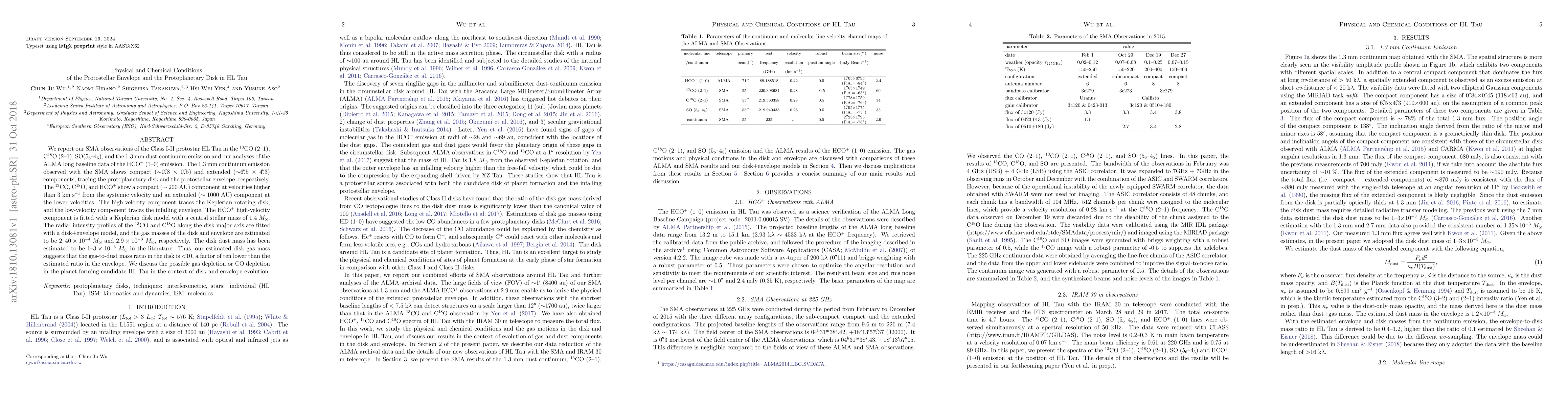 This study uses SMA and ALMA observations to analyze the physical and chemical conditions of the protostellar envelope and protoplanetary disk in HL Tau. The findings reveal a compact, high-velocity Keplerian rotating disk and an extended, low-velocity infalling envelope, with estimated gas masses suggesting a significantly lower gas-to-dust ratio in the disk compared to the envelope.