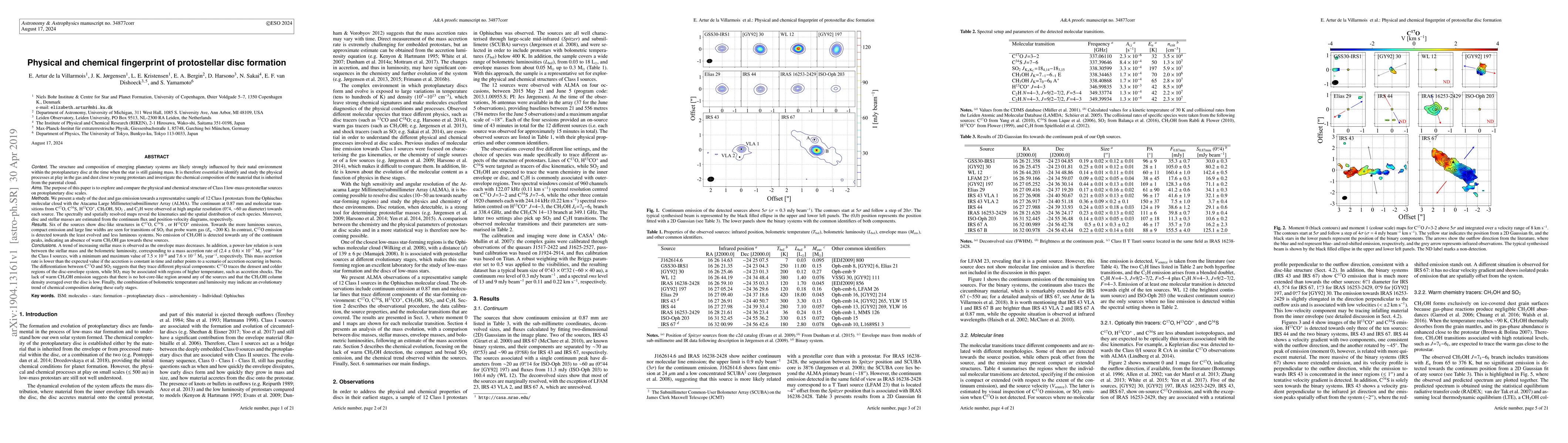(Abridged) The purpose of this paper is to explore and compare the physical and chemical structure of Class I low-mass protostellar sources on protoplanetary disc scales. We present a study of the dust and gas emission towards a representative sample of 12 Class I protostars from the Ophiuchus molecular cloud with the Atacama Large Millimeter/submillimeter Array (ALMA). The continuum at 0.87 mm and molecular transitions from C17O, C34S, H13CO+, CH3OH, SO2 , and C2H were observed at high angular resolution (0.4", ~60 au diameter) towards each source. Disc and stellar masses are estimated from the continuum flux and position-velocity diagrams, and six of the sources show disc-like structures. Towards the more luminous sources, compact emission and large line widths are seen for transitions of SO2 that probe warm gas (Eu ~200 K). In contrast, C17O emission is detected towards the least evolved and less luminous systems. No emission of CH3OH is detected towards any of the continuum peaks, indicating an absence of warm CH3OH gas towards these sources. A power-law relation is seen between the stellar mass and the bolometric luminosity, corresponding to a mass accretion rate of (2.4 +/- 0.6) x 10^-7 Msun/year for the Class I sources. This mass accretion rate is lower than the expected value if the accretion is constant in time and rather points to a scenario of accretion occurring in bursts. The differentiation between C17O and SO2 suggests that they trace different physical components: C17O traces the densest and colder regions of the disc-envelope system, while SO2 may be associated with regions of higher temperature, such as accretion shocks. The lack of warm CH3OH emission suggests that there is no hot-core-like region around any of the sources and that the CH3OH column density averaged over the disc is low.