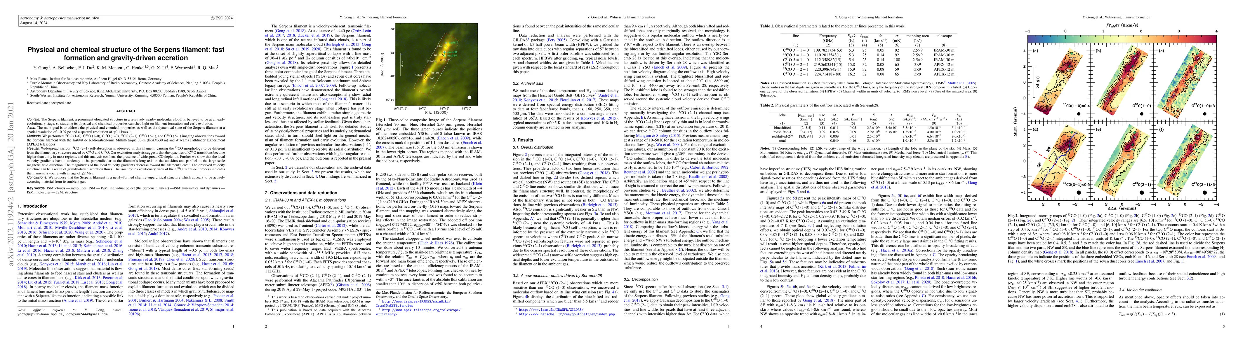 The Serpens filament, a young, nearby molecular cloud, exhibits rapid formation and gravity-driven accretion, as evidenced by its physical and chemical properties and the observed velocity gradients perpendicular to its long axis. The filament's youth, indicated by CO depletion and an age of $\lesssim$2 Myr, suggests it is actively accreting material.