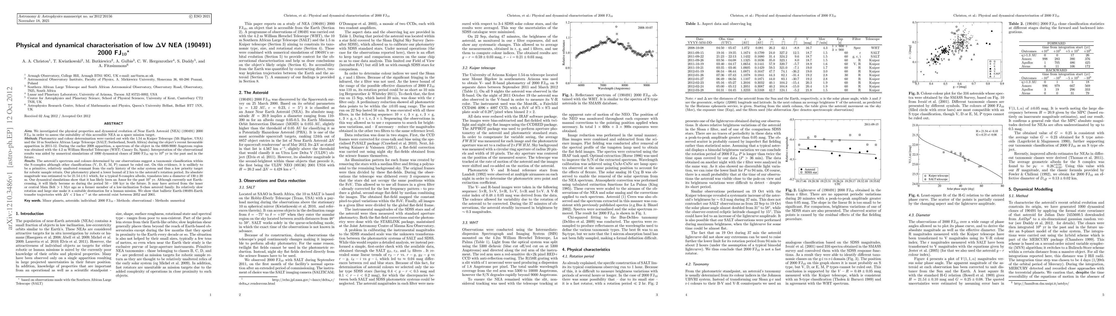 We investigated the physical properties and dynamical evolution of Near Earth Asteroid (NEA) (190491) 2000 FJ10 in order to assess the suitability of this accessible NEA as a space mission target. Photometry and colour determination were carried out with the 1.54 m Kuiper Telescope and the 10 m Southern African Large Telescope during the object's recent favourable apparition in 2011-12. During the earlier 2008 apparition, a spectrum of the object in the 6000-9000 Angstrom region was obtained with the 4.2 m William Herschel Telescope. Interpretation of the observational results was aided by numerical simulations of 1000 dynamical clones of 2000 FJ10 up to 10^6 yr in the past and in the future. The asteroid's spectrum and colours determined by our observations suggest a taxonomic classification within the S-complex although other classifications (V, D, E, M, P) cannot be ruled out. On this evidence, it is unlikely to be a primitive, relatively unaltered remnant from the early history of the solar system and thus a low priority target for robotic sample return. Our photometry placed a lower bound of 2 hrs to the asteroid's rotation period. Its absolute magnitude was estimated to be 21.54+-0.1 which, for a typical S-complex albedo, translates into a diameter of 130+-20 m. Our dynamical simulations show that it has likely been an Amor for the past 10^5 yr. Although currently not Earth-crossing, it will likely become so during the period 50 - 100 kyr in the future. It may have arrived from the inner or central Main Belt > 1 Myr ago as a former member of a low-inclination S-class asteroid family. Its relatively slow rotation and large size make it a suitable destination for a human mission. We show that ballistic Earth-190491-Earth transfer trajectories with Delta-V < 2 km s^-1 at the asteroid exist between 2052 and 2061.