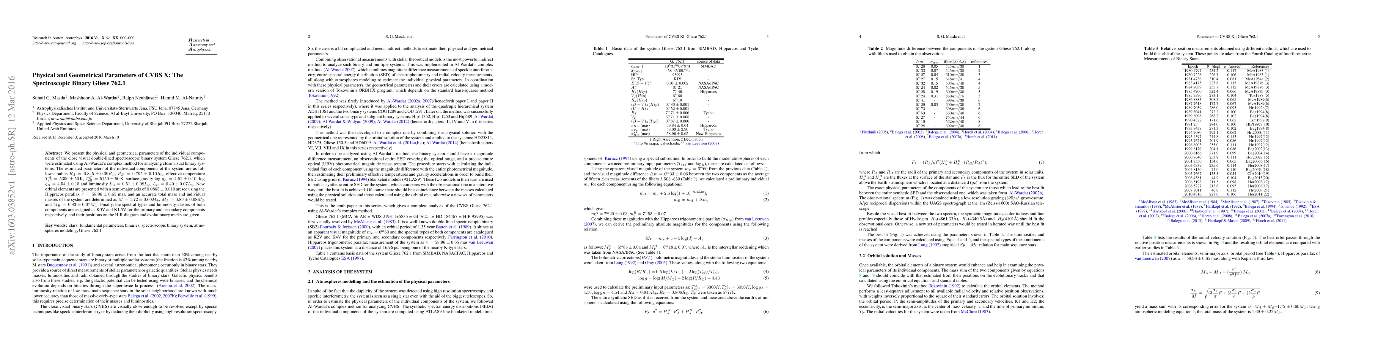 We present the physical and geometrical parameters of the individual components of the close visual double-lined spectroscopic binary system Gliese 762.1, which were estimated using Al-Wardat's complex method for analyzing close visual binary systems. The estimated parameters of the individual components of the system are as follows: radius $R_{A}=0.845\pm0.09 R_\odot$, $R_{B}=0.795\pm0.10 R_\odot$, effective temperature $T_{\rm eff}^{A} =5300\pm50$\,K, $T_{\rm eff}^{B} =5150\pm50$\,K, surface gravity log $g_{A}=4.52\pm0.10$, log $g_{B}=4.54\pm0.15$ and luminosity $L_A=0.51\pm0.08 L_\odot$, $L_B=0.40\pm0.07L_\odot$. New orbital elements are presented with a semi-major axis of $0.0865 \pm 0.010 $ arcsec using the Hippracos parallax $\pi=58.96\pm0.65$ mas, and an accurate total mass and individual masses of the system are determined as $M=1.72\pm0.60M_\odot$, $M_A=0.89 \pm0.08M_\odot$ and $M_B=0.83 \pm0.07M_\odot$. Finally, the spectral types and luminosity classes of both components are assigned as K0V and K1.5V for the primary and secondary components respectively, and their positions on the H-R diagram and evolutionary tracks are given.