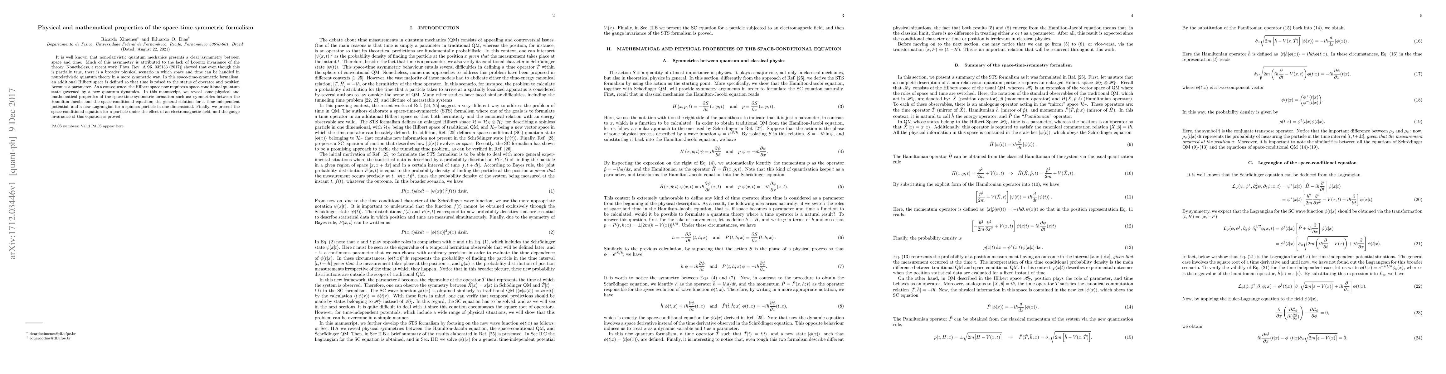 It is well known that nonrelativistic quantum mechanics presents a clear asymmetry between space and time. Much of this asymmetry is attributed to the lack of Lorentz invariance of the theory. Nonetheless, a recent work [Phys. Rev. A \textbf{95}, 032133 (2017)] showed that even though this is partially true, there is a broader physical scenario in which space and time can be handled in nonrelativistic quantum theory in a more symmetric way. In this space-time-symmetric formalism, an additional Hilbert space is defined so that time is raised to the status of operator and position becomes a parameter. As a consequence, the Hilbert space now requires a space-conditional quantum state governed by a new quantum dynamics. In this manuscript, we reveal some physical and mathematical properties of the space-time-symmetric formalism such as: symmetries between the Hamilton-Jacobi and the space-conditional equation; the general solution for a time-independent potential; and a new Lagrangian for a spinless particle in one dimensional. Finally, we present the space-conditional equation for a particle under the effect of an electromagnetic field, and the gauge invariance of this equation is proved.