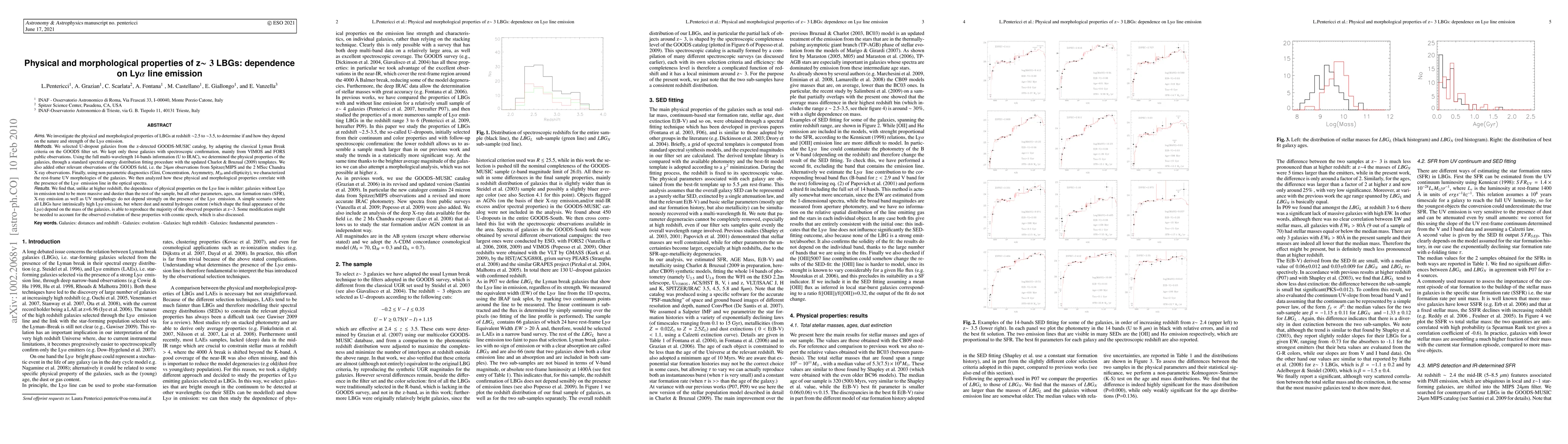 This paper examines the physical and morphological properties of LBGs at z~2.5 to ~3.5, focusing on how these properties relate to Lyalpha emission. The study finds that galaxies without Lyalpha emission tend to be more massive and dustier, while other factors like age, SFR, and UV morphology show weaker dependence on Lyalpha presence.