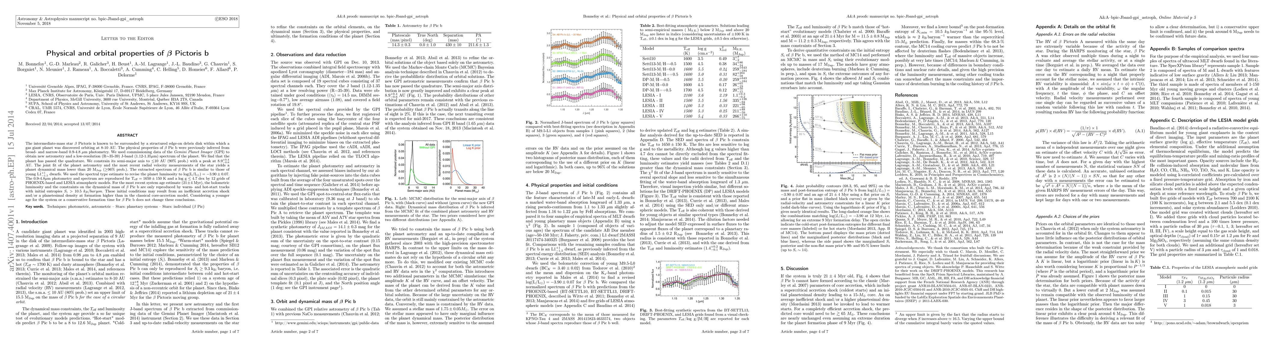 The intermediate-mass star Beta Pictoris is known to be surrounded by a structured edge-on debris disk within which a gas giant planet was discovered orbiting at 8-10 AU. The physical properties of Beta Pic b were previously inferred from broad and narrow-band 0.9-4.8 microns photometry. We used commissioning data of the Gemini Planet Imager (GPI) to obtain new astrometry and a low-resolution (R=35-39) J-band (1.12-1.35 microns) spectrum of the planet. We find that the planet has passed the quadrature. We constrain its semi-major axis to $\leq$ 10 AU (90 % prob.) with a peak at 8.9+0.4-0.6 AU. The joint fit of the planet astrometry and the most recent radial velocity measurements of the star yields a planet's dynamical mass $\leq$ 20 MJup (greater than 96 % prob.). The extracted spectrum of Beta Pic b is similar to those of young L1-1.5+1 dwarfs. We use the spectral type estimate to revise the planet luminosity to log(L/Lsun)=-3.90+-0.07. The 0.9-4.8 microns photometry and spectrum are reproduced for Teff=1650+-150 K and a log g lower than 4.7 dex by 12 grids of PHOENIX-based and LESIA atmospheric models. If we adopt the most recent system age estimate (21+-4 Myr), the bolometric luminosity and the constraints on the dynamical mass of Beta Pic b are only reproduced by warm- and hot-start tracks with initial entropies Si greater than 10.5 kB/baryon. Such initial conditions may result from an inefficient accretion shock and/or a planetesimal density at formation higher than in the classical core accretion model. Considering a younger age for the system or a conservative formation time for Beta Pic b does not change these conclusions.