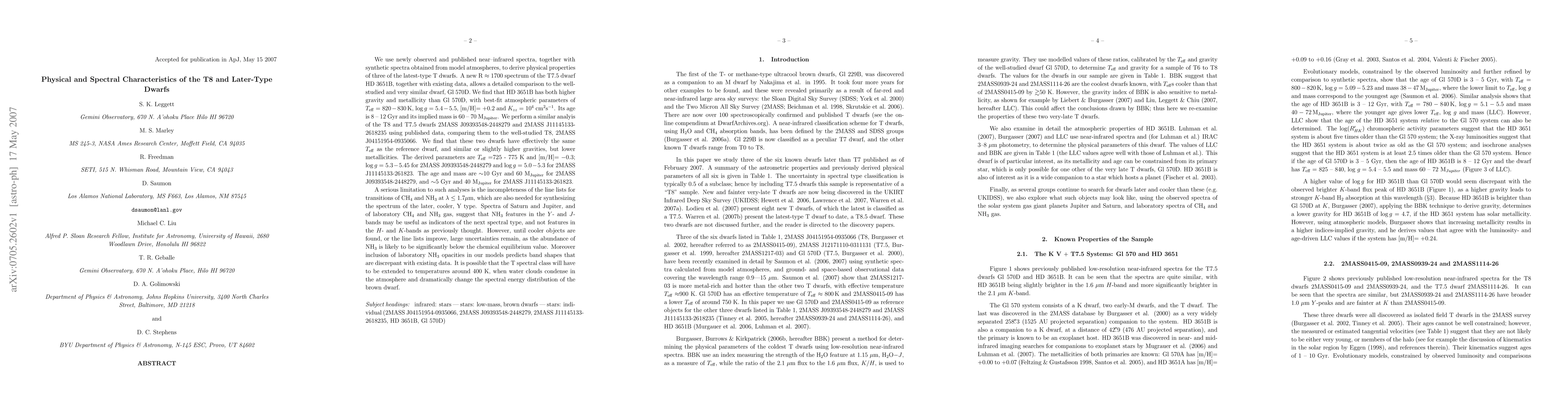 We use new and published near-IR spectra, with synthetic spectra, to derive physical properties of three of the latest-type T dwarfs. A new R~1700 spectrum of the T7.5 dwarf HD 3651B, with existing data, allows a detailed comparison to the well-studied and very similar dwarf, Gl 570D. We find that HD 3651B has both higher gravity and metallicity than Gl 570D, with Teff=820-830K, log g= 5.4-5.5, [m/H]= +0.2 and Kzz=10^4cm^2/s. Its age is 8-12 Gyr and its implied mass is 60-70 M_Jup. We perform a similar analyis of the T8 and T7.5 dwarfs 2MASS J09393548-2448279 and 2MASS J11145133-2618235 using published data, comparing them to the well-studied T8, 2MASS J04151954-0935066. We find that the two dwarfs have the same Teff as the reference dwarf, and similar gravities, but lower metallicities. The parameters are Teff=725-775K and [m/H]= -0.3; log g=5.3-5.45 for 2MASS J09393548-2448279 and log g=5.0-5.3 for 2MASS J11145133- 261823. The age and mass are ~10Gyr and 60M_Jup for 2MASS J09393548-2448279, and ~5 Gyr and 40M_Jup for 2MASS J11145133-261823. A serious limitation is the incompleteness of the line lists of CH4 and NH3 at lambda <1.7um. Spectra of Saturn and Jupiter, and of laboratory CH4 and NH3 gas, suggest that NH3 features in the Y- and J-bands may be useful as indicators of the next cooler spectral type, and not features in the H- and K-bands as previously thought. However large uncertainties remain, as the abundance of NH3 is likely to be significantly below the chemical equilibrium value, and inclusion of laboratory NH3 opacities predicts band shapes that are discrepant with existing data. It is possible that the T spectral class will have to be extended to low temperatures around 400K, when water clouds condense in the atmosphere [abridged].