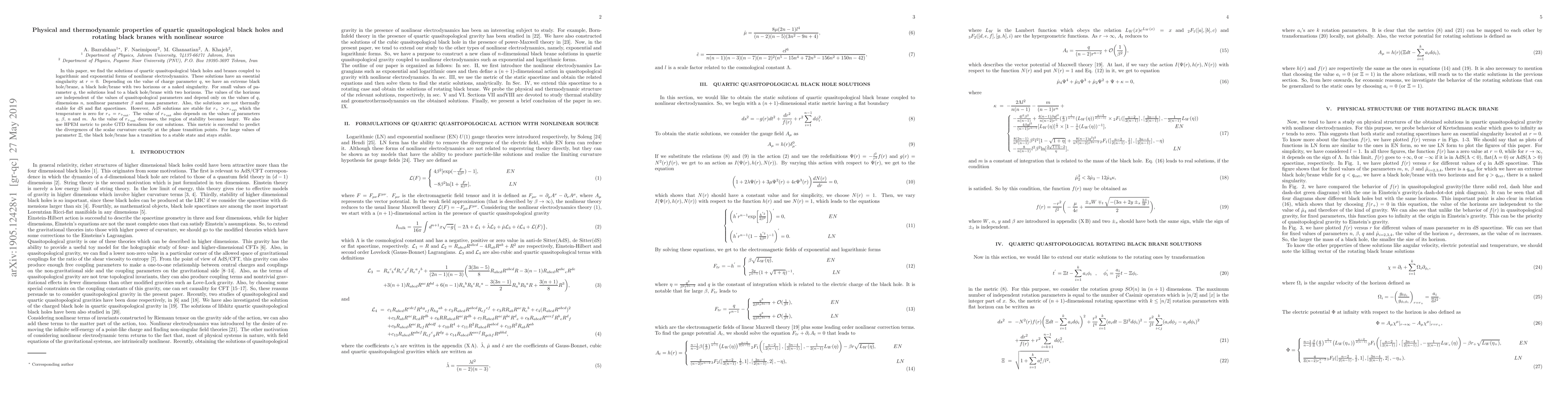 Researchers found solutions for quartic quasitopological black holes and rotating black branes with nonlinear sources, which can form extreme or stable states depending on charge parameter q, and have varying temperatures and horizons.