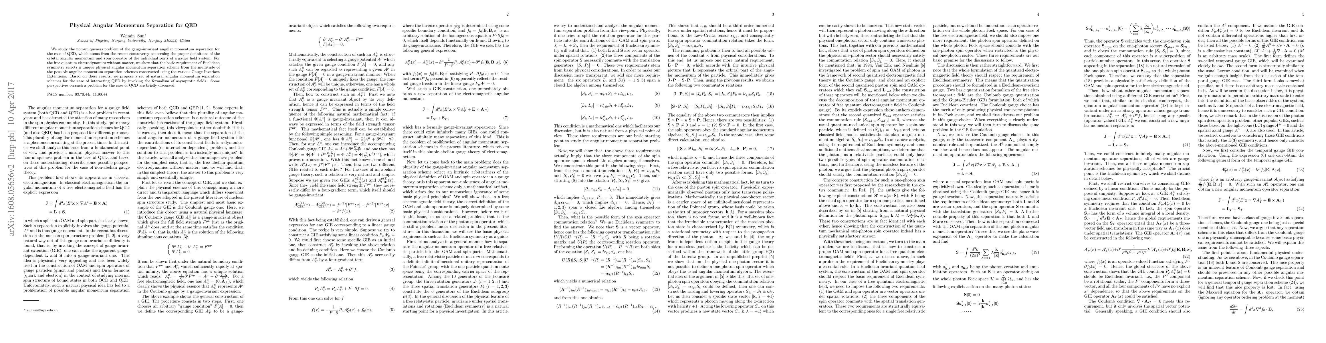 The paper presents a unique angular momentum separation scheme for free QED by leveraging Euclidean symmetry, and proposes natural separation schemes for interacting QED using asymptotic fields.