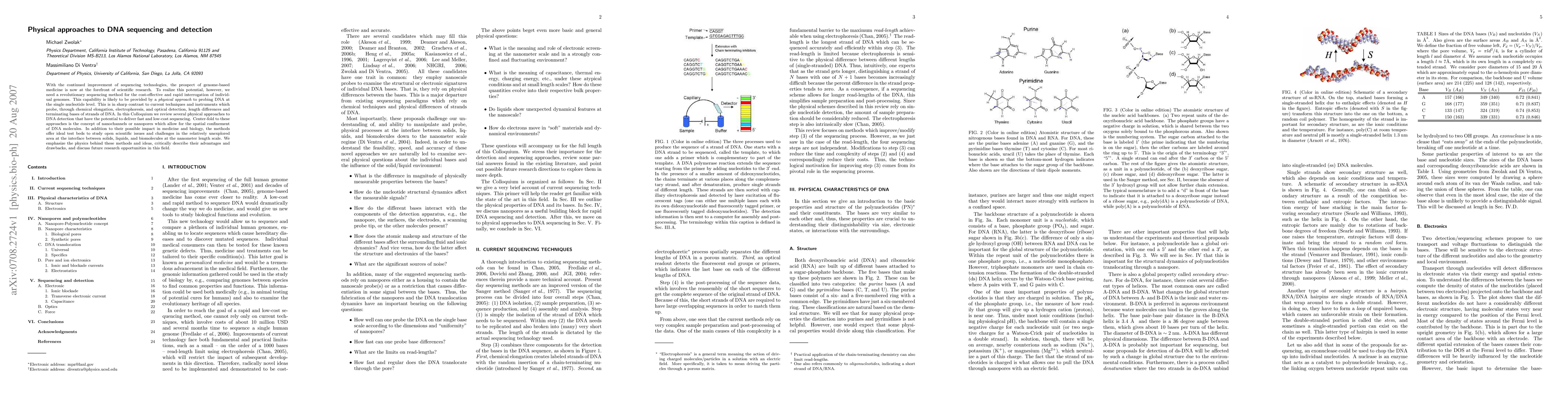 With the continued improvement of sequencing technologies, the prospect of genome-based medicine is now at the forefront of scientific research. To realize this potential, however, we need a revolutionary sequencing method for the cost-effective and rapid interrogation of individual genomes. This capability is likely to be provided by a physical approach to probing DNA at the single nucleotide level. This is in sharp contrast to current techniques and instruments which probe, through chemical elongation, electrophoresis, and optical detection, length differences and terminating bases of strands of DNA. In this Colloquium we review several physical approaches to DNA detection that have the potential to deliver fast and low-cost sequencing. Center-fold to these approaches is the concept of nanochannels or nanopores which allow for the spatial confinement of DNA molecules. In addition to their possible impact in medicine and biology, the methods offer ideal test beds to study open scientific issues and challenges in the relatively unexplored area at the interface between solids, liquids, and biomolecules at the nanometer length scale. We emphasize the physics behind these methods and ideas, critically describe their advantages and drawbacks, and discuss future research opportunities in this field.