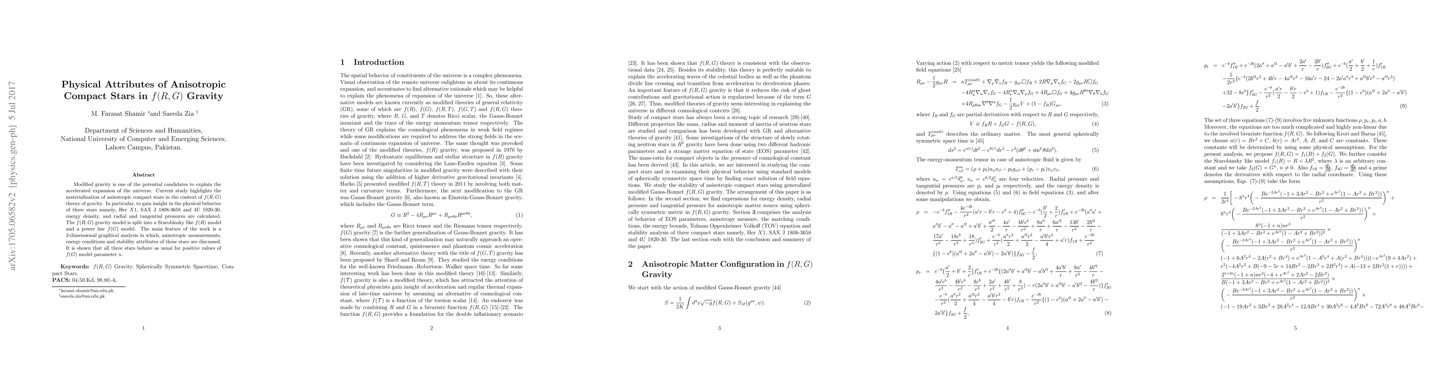 Modified gravity is one of the potential candidates to explain the accelerated expansion of the universe. Current study highlights the materialization of anisotropic compact stars in the context of $f(R,G)$ theory of gravity. In particular, to gain insight in the physical behavior of three stars namely, Her $X1$, SAX J $1808$-$3658$ and 4U $1820$-$30$, energy density, and radial and tangential pressures are calculated. The $f(R,G)$ gravity model is split into a Starobinsky like $f(R)$ model and a power law $f(G)$ model. The main feature of the work is a $3$-dimensional graphical analysis in which, anisotropic measurements, energy conditions and stability attributes of these stars are discussed. It is shown that all three stars behave as usual for positive values of $f(G)$ model parameter $n$.