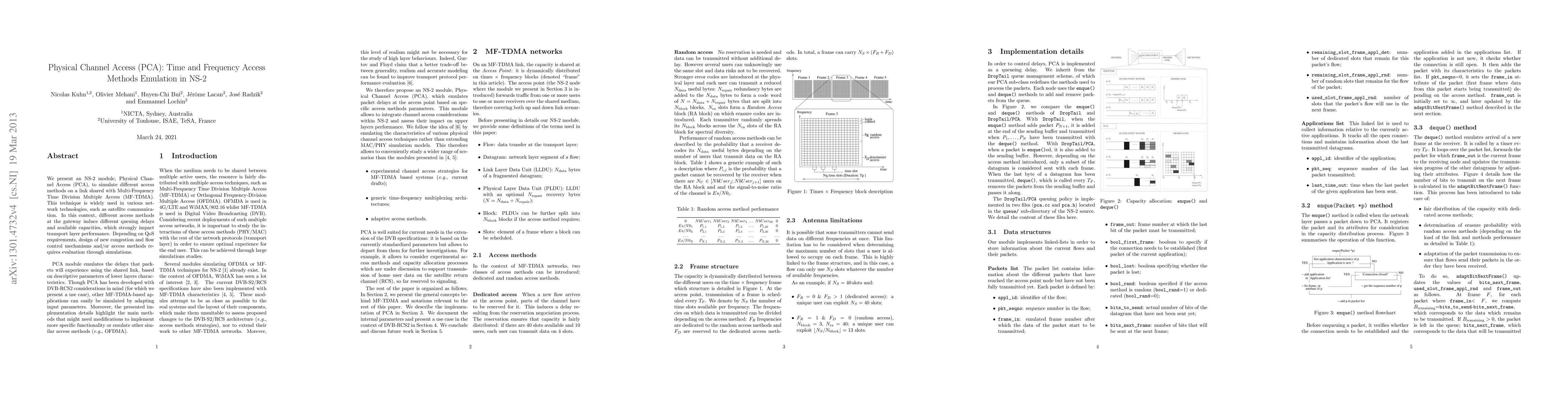 We present an NS-2 module, Physical Channel Access (PCA), to simulate different access methods on a link shared with Multi-Frequency Time Division Multiple Access (MF-TDMA). This tech- nique is widely used in various network technologies, such as satellite communication. In this context, different access methods at the gateway induce different queuing delays and available capacities, which strongly impact transport layer performance. Depending on QoS requirements, design of new congestion and flow control mechanisms and/or access methods requires evaluation through simulations. PCA module emulates the delays that packets will experience using the shared link, based on descriptive parameters of lower layers characteris- tics. Though PCA has been developed with DVB-RCS2 considerations in mind (for which we present a use case), other MF-TDMA-based appli- cations can easily be simulated by adapting input parameters. Moreover, the presented implementation details highlight the main methods that might need modifications to implement more specific functionality or emulate other similar access methods (e.g., OFDMA).