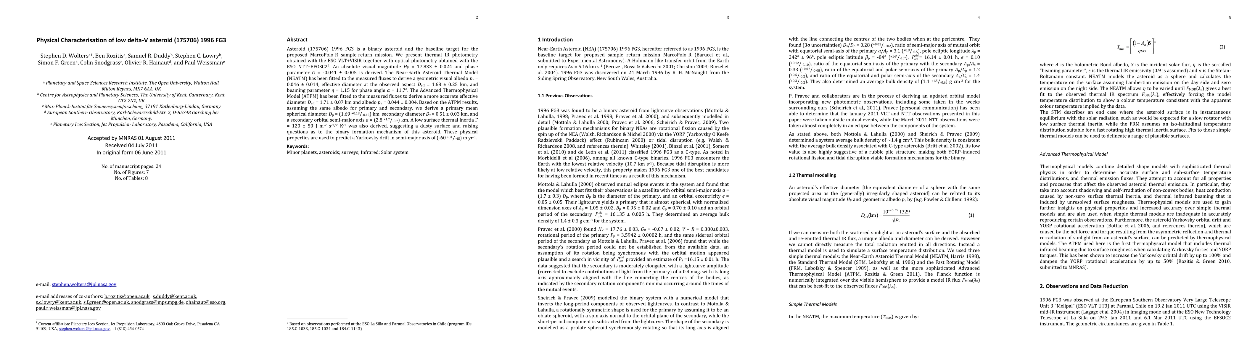 This study characterizes the binary asteroid (175706) 1996 FG3 using thermal IR and optical photometry, deriving an effective diameter of 1.71 km and a geometric visual albedo of 0.044, and suggesting a dusty surface with low thermal inertia. The findings inform the MarcoPolo-R mission and predict a Yarkovsky drift.