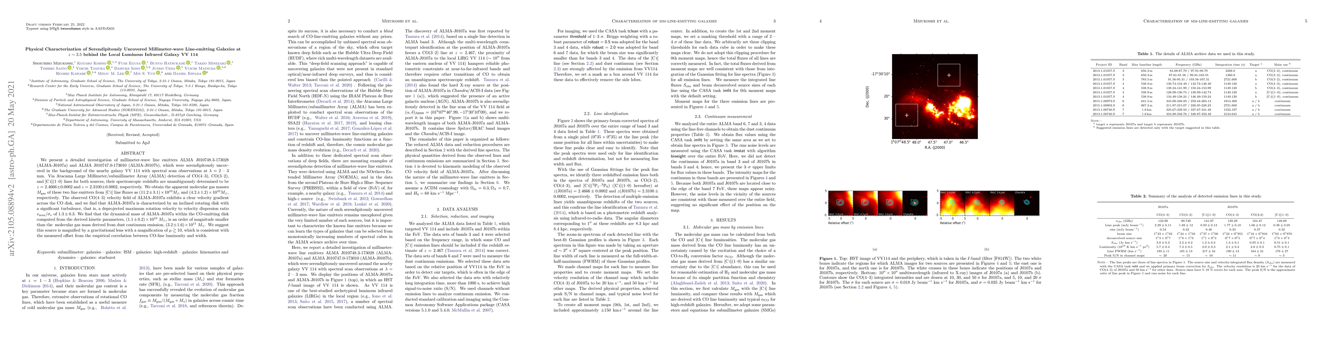 This paper investigates two millimeter-wave line-emitting galaxies (ALMA-J0107a and ALMA-J0107b) discovered behind the galaxy VV114, determining their redshifts and molecular gas masses via ALMA observations. ALMA-J0107a shows a rotating disk with significant turbulence, suggesting gravitational lensing magnification.