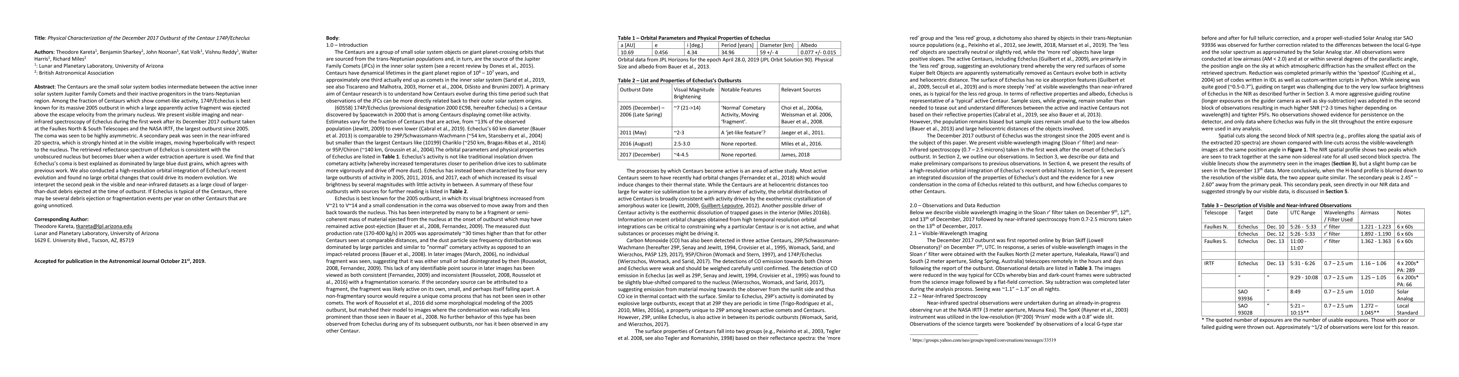 The 2017 outburst of Centaur 174P/Echeclus was studied using visible imaging and near-infrared spectroscopy, revealing a highly asymmetric coma with a secondary peak of larger-than-dust debris. The coma is dominated by large blue dust grains, and no significant orbital changes were detected. This suggests numerous unnoticed fragmentation events among Centaurs.