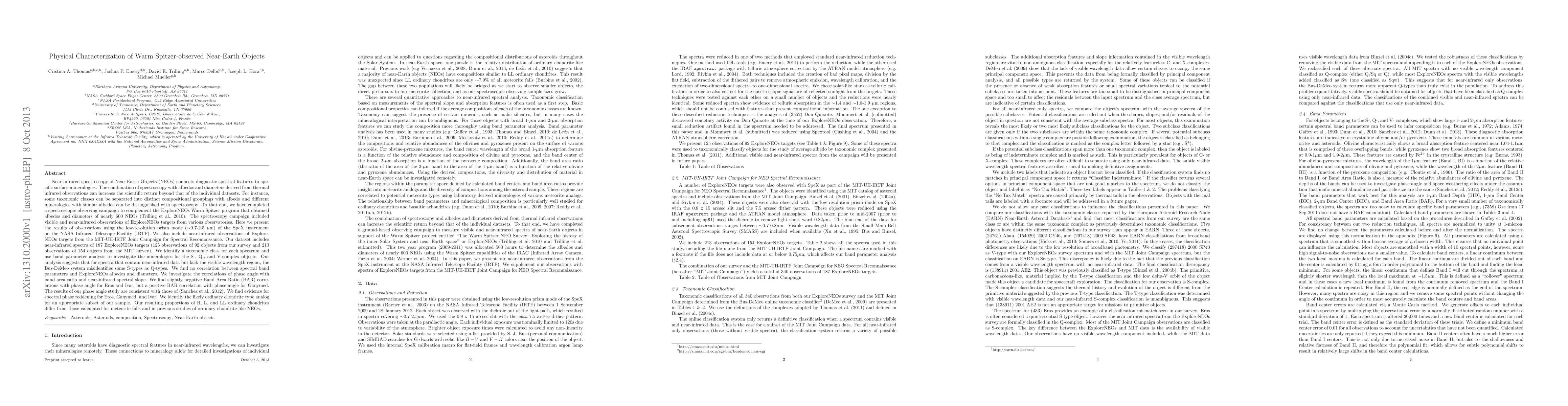 Near-infrared spectroscopy of Near-Earth Objects (NEOs) connects diagnostic spectral features to specific surface mineralogies. The combination of spectroscopy with albedos and diameters derived from thermal infrared observations can increase the scientific return beyond that of the individual datasets. To that end, we have completed a spectroscopic observing campaign to complement the ExploreNEOs Warm Spitzer program that obtained albedos and diameters of nearly 600 NEOs (Trilling et al. 2010). Here we present the results of observations using the low-resolution prism mode (~0.7-2.5 microns) of the SpeX instrument on the NASA Infrared Telescope Facility (IRTF). We also include near-infrared observations of ExploreNEOs targets from the MIT-UH-IRTF Joint Campaign for Spectral Reconnaissance. Our dataset includes near-infrared spectra of 187 ExploreNEOs targets (125 observations of 92 objects from our survey and 213 observations of 154 objects from the MIT survey). We identify a taxonomic class for each spectrum and use band parameter analysis to investigate the mineralogies for the S-, Q-, and V-complex objects. Our analysis suggests that for spectra that contain near-infrared data but lack the visible wavelength region, the Bus-DeMeo system misidentifies some S-types as Q-types. We find no correlation between spectral band parameters and ExploreNEOs albedos and diameters. We find slightly negative Band Area Ratio (BAR) correlations with phase angle for Eros and Ivar, but a positive BAR correlation with phase angle for Ganymed. We find evidence for spectral phase reddening for Eros, Ganymed, and Ivar. We identify the likely ordinary chondrite type analog for a subset of our sample. Our resulting proportions of H, L, and LL ordinary chondrites differ from those calculated for meteorite falls and in previous studies of ordinary chondrite-like NEOs.