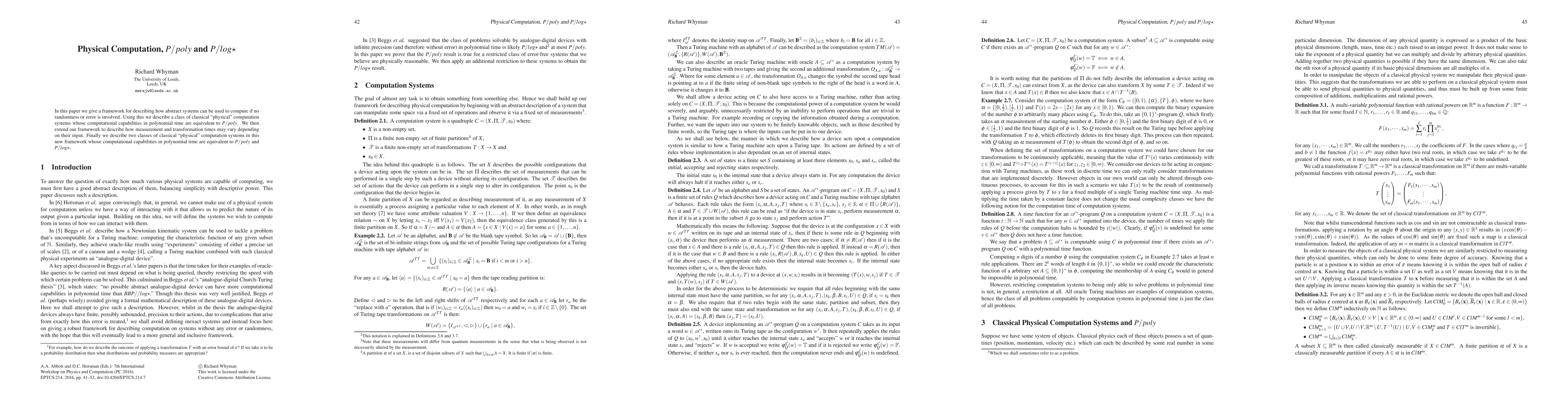 This paper introduces a framework for understanding 'physical' computation systems without randomness or error, showing their polynomial-time capabilities align with P/poly. It further expands this to accommodate varying measurement and transformation times, identifying systems whose polynomial-time capabilities match P/log*.
