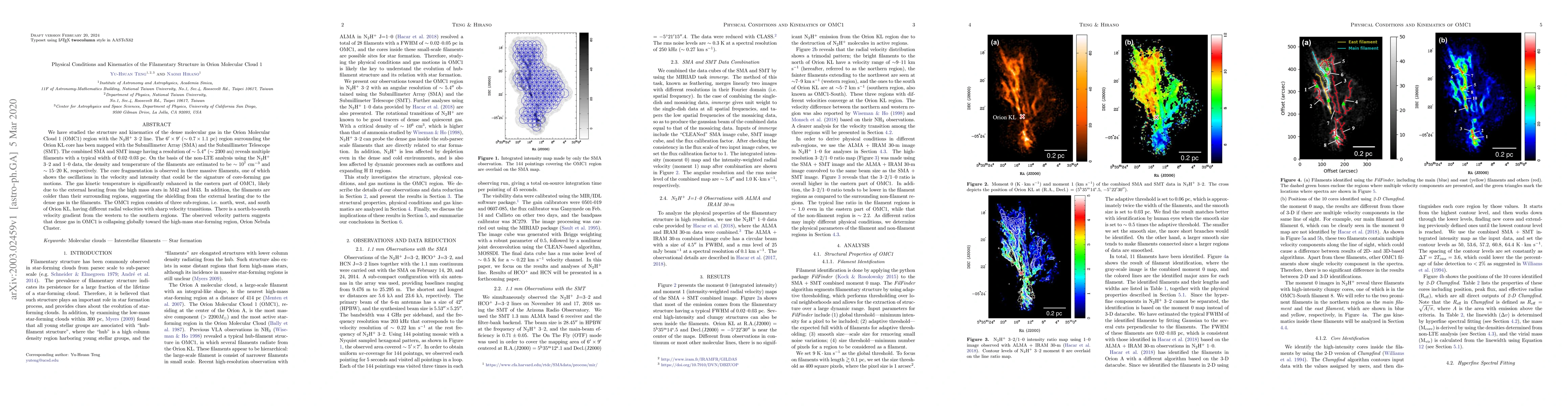 We have studied the structure and kinematics of the dense molecular gas in the Orion Molecular Cloud 1 (OMC1) region with the N2H+ 3-2 line. The 6'x9' (~0.7x1.1 pc) region surrounding the Orion KL core has been mapped with the Submillimeter Array (SMA) and the Submillimeter Telescope (SMT). The combined SMA and SMT image having a resolution of ~5.4" (~2300 au) reveals multiple filaments with a typical width of 0.02-0.03 pc. On the basis of the non-LTE analysis using the N2H+ 3-2 and 1-0 data, the density and temperature of the filaments are estimated to be ~10^7 cm-3 and ~15-20 K, respectively. The core fragmentation is observed in three massive filaments, one of which shows the oscillations in the velocity and intensity that could be the signature of core-forming gas motions. The gas kinetic temperature is significantly enhanced in the eastern part of OMC1, likely due to the external heating from the high mass stars in M42 and M43. In addition, the filaments are colder than their surrounding regions, suggesting the shielding from the external heating due to the dense gas in the filaments. The OMC1 region consists of three sub-regions, i.e. north, west, and south of Orion KL, having different radial velocities with sharp velocity transitions. There is a north-to-south velocity gradient from the western to the southern regions. The observed velocity pattern suggests that dense gas in OMC1 is collapsing globally toward the high-mass star-forming region, Orion Nebula Cluster.