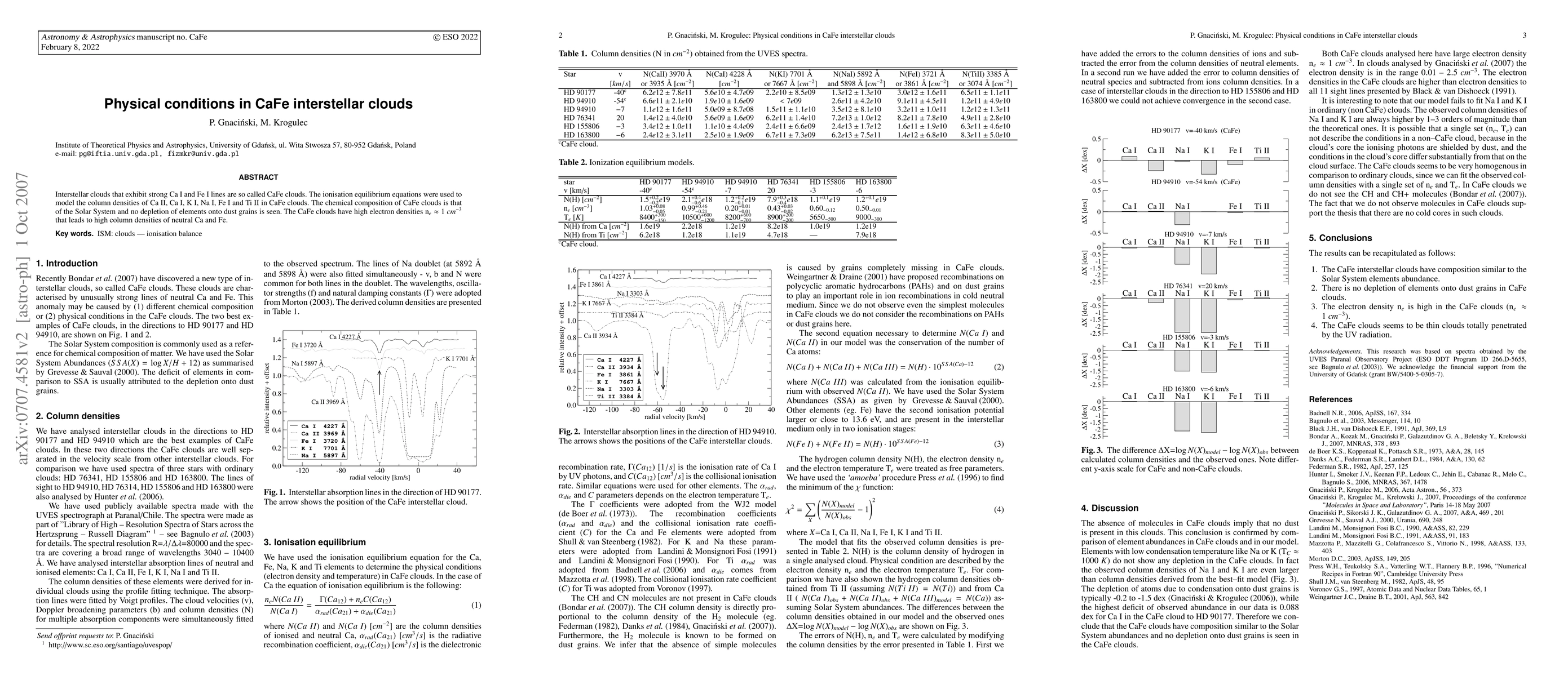 Interstellar clouds that exhibit strong Ca I and Fe I lines were called CaFe clouds. The ionisation equilibrium equations were used to model the column densities of Ca II, Ca I, K I, Na I, Fe I and Ti II in CaFe clouds. The chemical composition of CaFe clouds is that of the Solar System and no depletion of elements onto dust grains is seen. The CaFe clouds have high electron densities n=1 cm^-3 that leads to high column densities of neutral Ca and Fe.