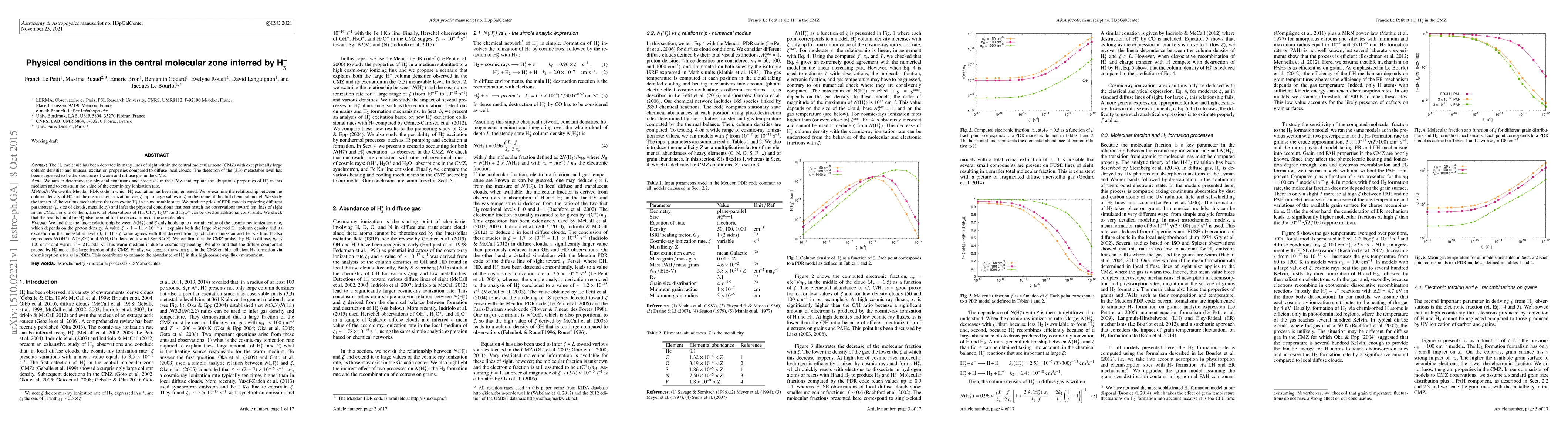 This study investigates the physical conditions in the central molecular zone (CMZ) using H3+ observations, finding that a cosmic-ray ionization rate of $\zeta \sim 1 - 11 \times 10^{-14}$ s$^{-1}$ explains the large H3+ column density and its metastable state excitation. The CMZ is inferred to be diffuse, warm (T $\sim$ 212-505 K), and largely filled by this warm, cosmic-ray heated gas.