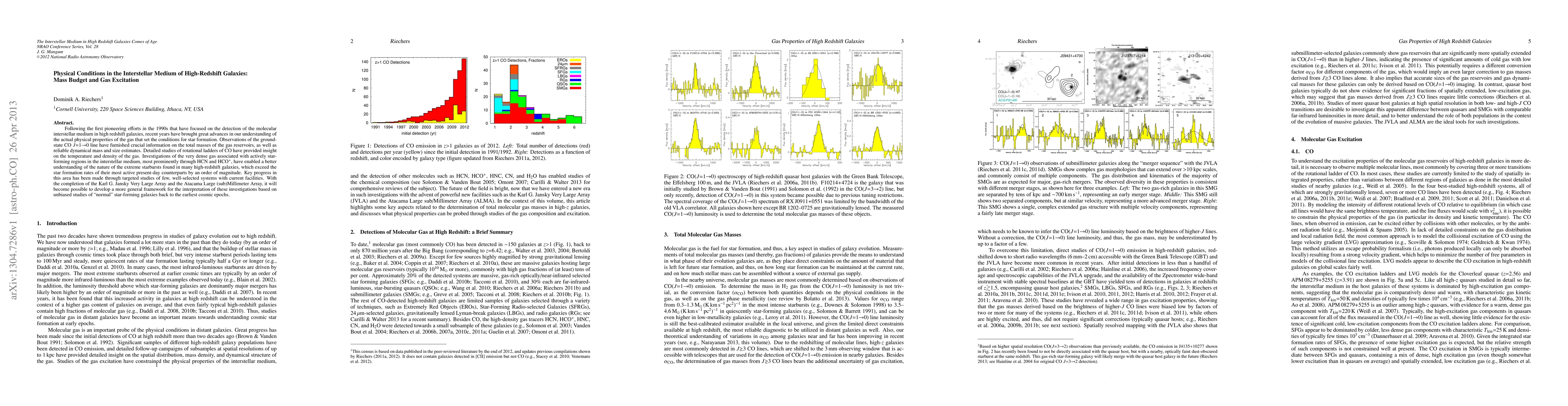 This paper reviews advances in understanding the physical conditions of the interstellar medium in high-redshift galaxies, focusing on gas mass, excitation, and star formation rates, using CO and HCN/HCO+ observations. Upcoming large-scale facilities promise to provide a broader, unbiased view of these conditions across diverse galaxies.