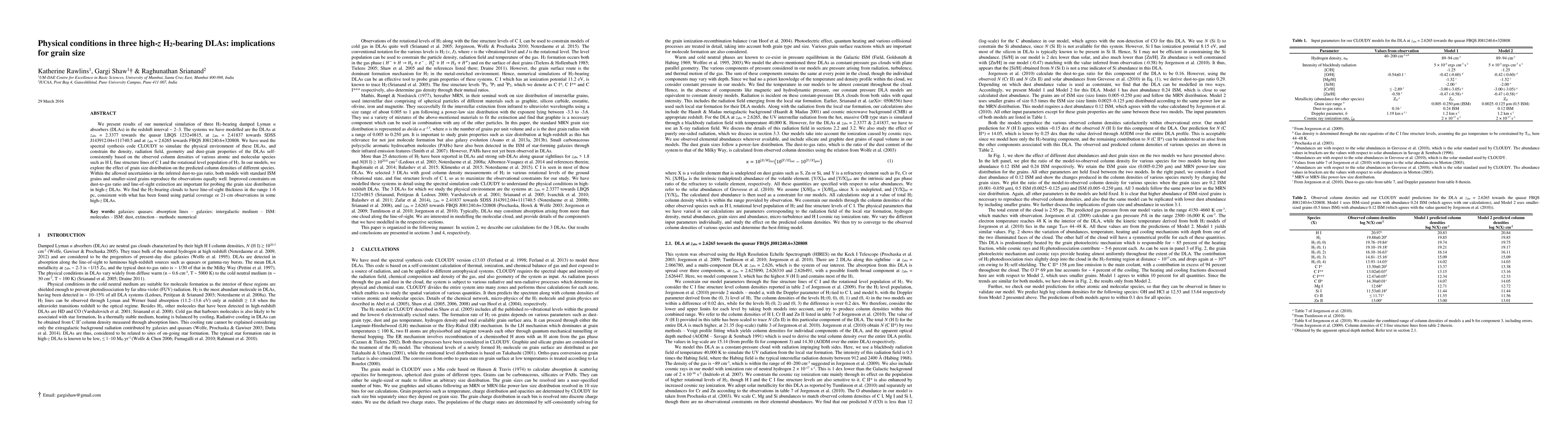 We present results of our numerical simulation of three H2-bearing damped Lyman alpha absorbers (DLAs) in the redshift interval ~ 2-3. The systems we have modelled are the DLAs at zabs = 2.3377 towards the quasar LBQS 1232+0815, at zabs = 2.41837 towards SDSS J143912.04+111740.5 and at zabs = 2.6265 towards FBQS J081240.6+320808. We have used the spectral synthesis code CLOUDY to simulate the physical environment of these DLAs, and constrain the density, radiation field, geometry and dust-grain properties of the DLAs self-consistently based on the observed column densities of various atomic and molecular species such as H I, fine structure lines of C I and the rotational level population of H2. In our models, we explore the effect of grain size distribution on the predicted column densities of different species. Within the allowed uncertainties in the inferred dust-to-gas ratio, both models with standard ISM grains and smaller-sized grains reproduce the observations equally well. Improved constraints on dust-to-gas ratio and line-of-sight extinction are important for probing the grain size distribution in high-z DLAs. We find the H2-bearing clouds to have line-of-sight thickness in the range 1-6 pc, consistent with what has been found using partial coverage or 21-cm observations in some high-z DLAs.