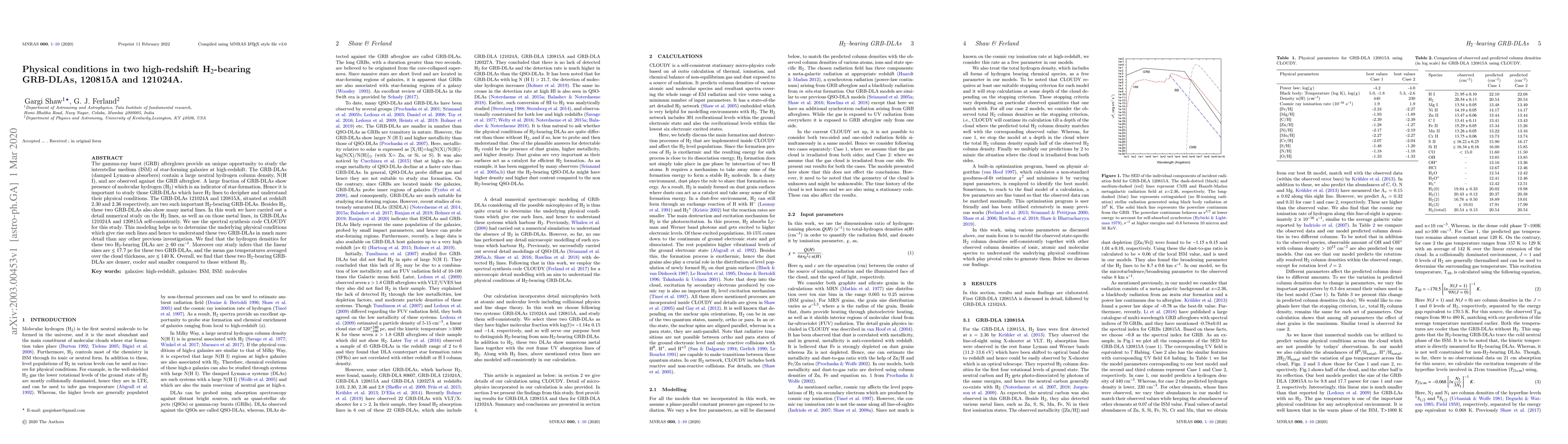 This paper investigates the physical conditions in two high-redshift H$_2$-bearing GRB-DLAs, 121024A and 120815A, using detailed numerical modeling with the CLOUDY code. The study finds hydrogen densities of $\geq$ 60 cm$^{-3}$, linear sizes of $\leq$ 17.7 pc, and mean gas temperatures of $\leq$ 140 K, providing deeper insights into the interstellar medium of star-forming galaxies at high redshifts.