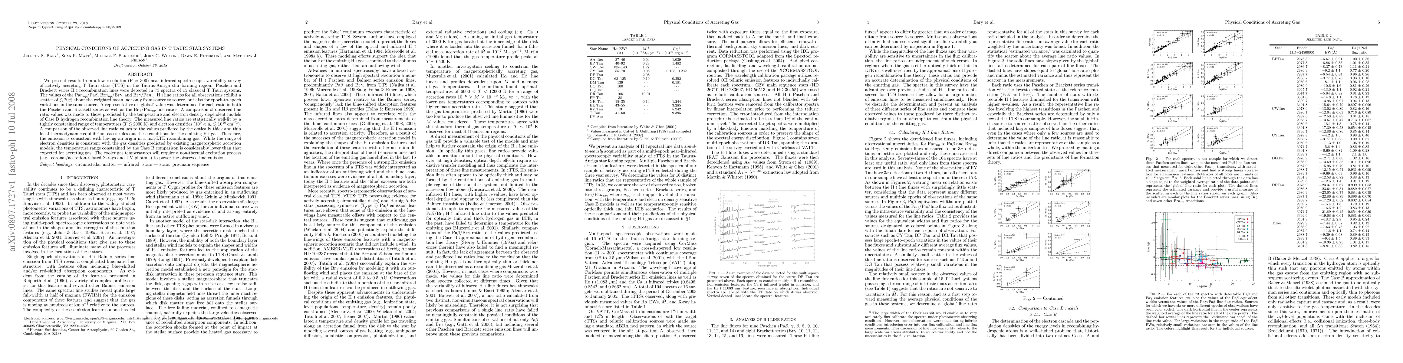 This study investigates the physical conditions of accreting gas in T Tauri star systems using near-infrared spectroscopy, finding that the gas temperatures are significantly cooler than expected, suggesting non-thermal excitation processes such as X-rays and UV photons. The observed hydrogen recombination line ratios align with a narrow range of electron densities and temperatures, ruling out optically thick and thin local thermodynamic equilibrium conditions.