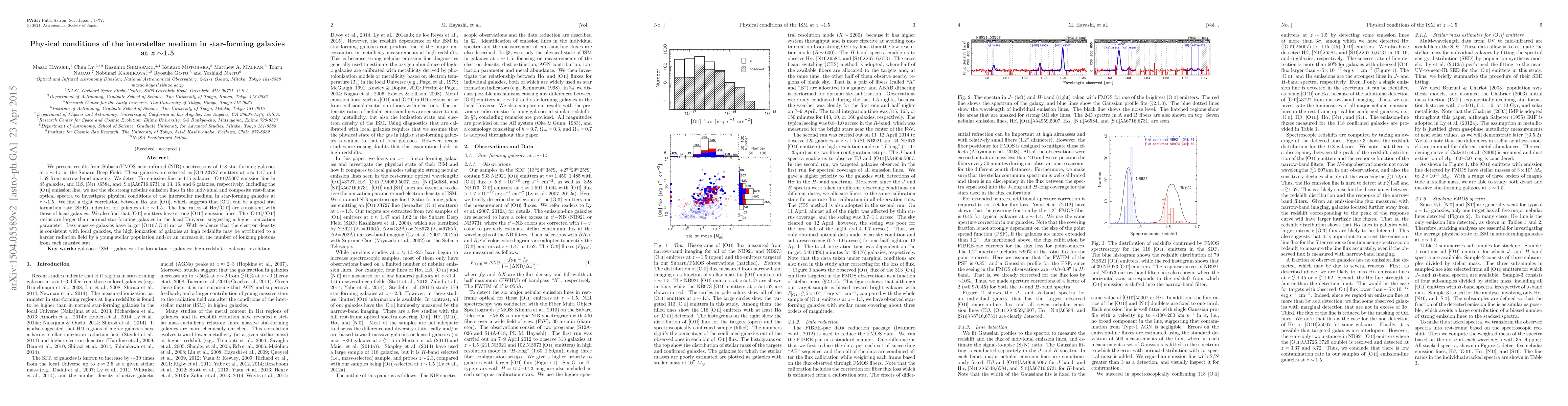 We present results from Subaru/FMOS near-infrared (NIR) spectroscopy of 118 star-forming galaxies at $z\sim1.5$ in the Subaru Deep Field. These galaxies are selected as [OII]$\lambda$3727 emitters at $z\approx$ 1.47 and 1.62 from narrow-band imaging. We detect H$\alpha$ emission line in 115 galaxies, [OIII]$\lambda$5007 emission line in 45 galaxies, and H$\beta$, [NII]$\lambda$6584, and [SII]$\lambda\lambda$6716,6731 in 13, 16, and 6 galaxies, respectively. Including the [OII] emission line, we use the six strong nebular emission lines in the individual and composite rest-frame optical spectra to investigate physical conditions of the interstellar medium in star-forming galaxies at $z\sim$1.5. We find a tight correlation between H$\alpha$ and [OII], which suggests that [OII] can be a good star formation rate (SFR) indicator for galaxies at $z\sim1.5$. The line ratios of H$\alpha$/[OII] are consistent with those of local galaxies. We also find that [OII] emitters have strong [OIII] emission lines. The [OIII]/[OII] ratios are larger than normal star-forming galaxies in the local Universe, suggesting a higher ionization parameter. Less massive galaxies have larger [OIII]/[OII] ratios. With evidence that the electron density is consistent with local galaxies, the high ionization of galaxies at high redshifts may be attributed to a harder radiation field by a young stellar population and/or an increase in the number of ionizing photons from each massive star.