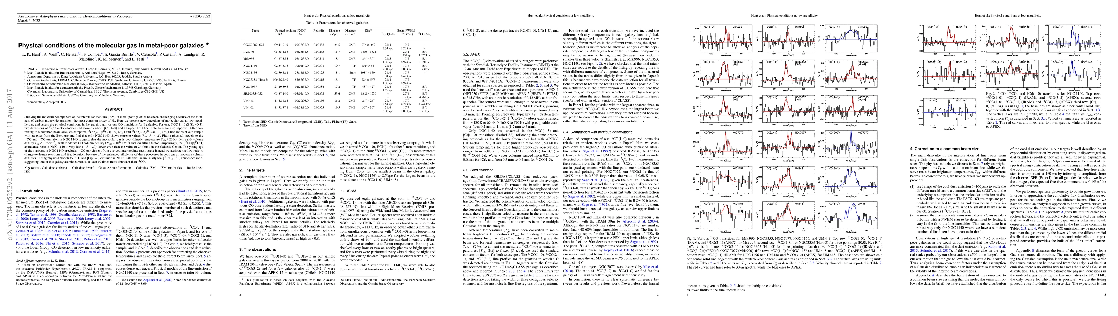 Studying the molecular component of the interstellar medium in metal-poor galaxies has been challenging because of the faintness of carbon monoxide emission, the most common proxy of H2. Here we present new detections of molecular gas at low metallicities, and assess the physical conditions in the gas through various CO transitions for 8 galaxies. For one, NGC 1140 (Z/Zsun ~ 0.3), two detections of 13CO isotopologues and atomic carbon, [CI](1-0), and an upper limit for HCN(1-0) are also reported. After correcting to a common beam size, we compared 12CO(2-1)/12CO(1-0) (R21) and 12CO(3-2)/12CO(1-0) (R31) line ratios of our sample with galaxies from the literature and find that only NGC 1140 shows extreme values (R21 ~ R31 ~ 2). Fitting physical models to the 12CO and 13CO emission in NGC 1140 suggests that the molecular gas is cool (kinetic temperature Tkin<=20 K), dense (H2 volume density nH2 >= $10^6$ cm$^{-3}$), with moderate CO column density (NCO ~ $10^{16}$ cm$^{-2}$) and low filling factor. Surprisingly, the [12CO]/[13CO] abundance ratio in NGC 1140 is very low (~ 8-20), lower even than the value of 24 found in the Galactic Center. The young age of the starburst in NGC 1140 precludes 13C enrichment from evolved intermediate-mass stars; instead we attribute the low ratio to charge-exchange reactions and fractionation, because of the enhanced efficiency of these processes in cool gas at moderate column densities. Fitting physical models to 12CO and [CI](1-0) emission in NGC 1140 gives an unusually low [12CO]/[12C] abundance ratio, suggesting that in this galaxy atomic carbon is at least 10 times more abundant than 12CO.