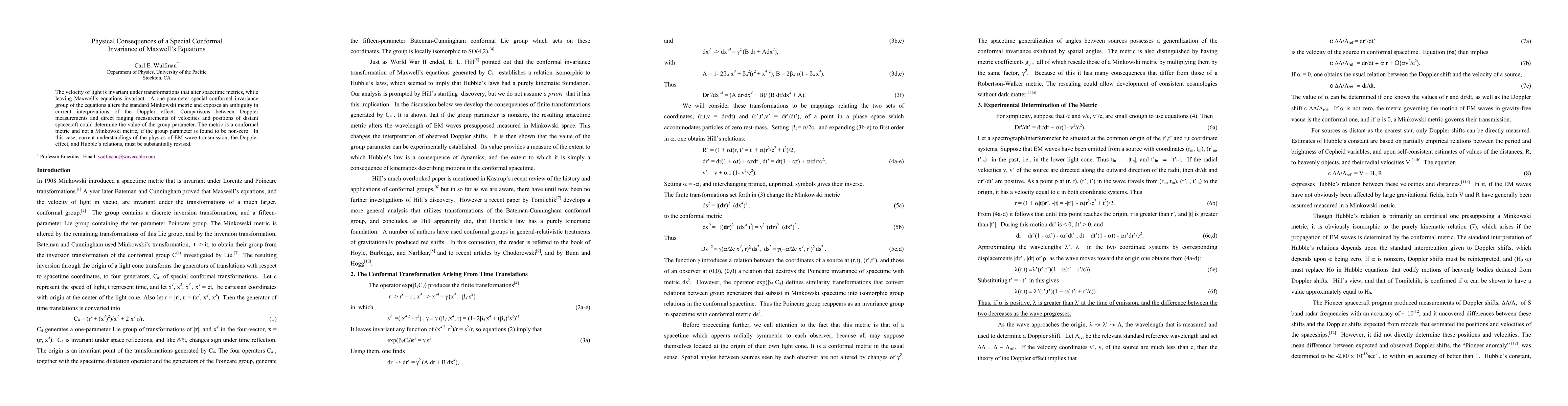 The velocity of light is invariant under transformations that alter space-time metrics, while leaving Maxwell's equations invariant. A one-parameter special conformal invariance group of the equations exposes an ambiguity in current interpretations of the Doppler effect. Comparisons between Doppler measurements and direct measurements of velocities and positions of distant spacecraft could determine the value of the group parameter. The metric is a conformal metric and not a Minkowski metric if the group parameter is found to be non-zero. In this case, current understandings of the physics of EM wave transmission, the Doppler effect, and Hubble's relations, must be substantially revised.