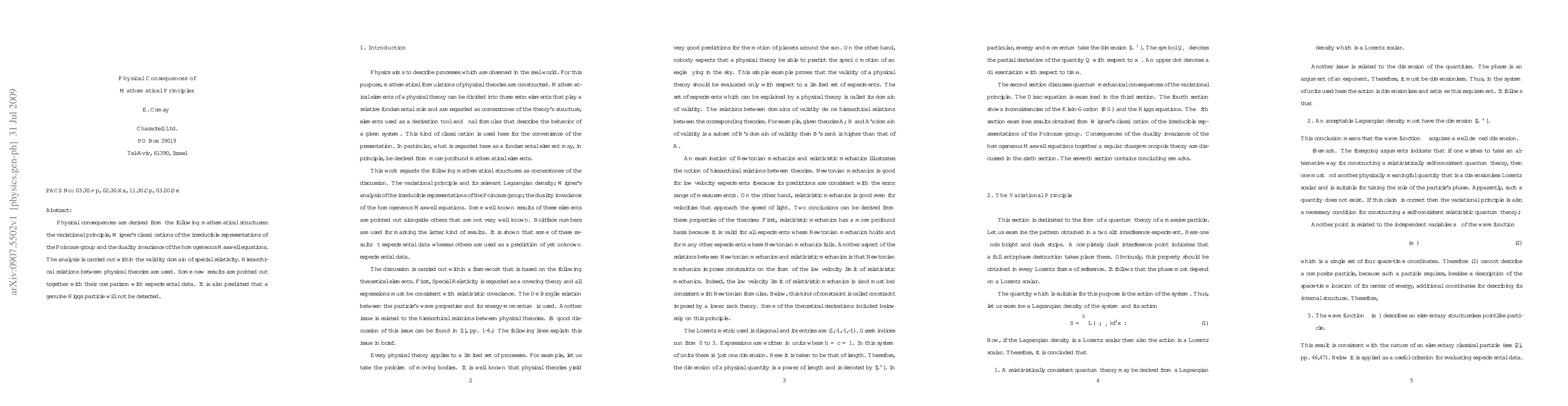 This paper explores the physical implications derived from the variational principle, Wigner's classifications, and Maxwell's equations within special relativity, revealing hierarchical connections between physical theories and predicting the non-detection of a genuine Higgs particle. Experimental data comparisons and new theoretical results are also discussed.