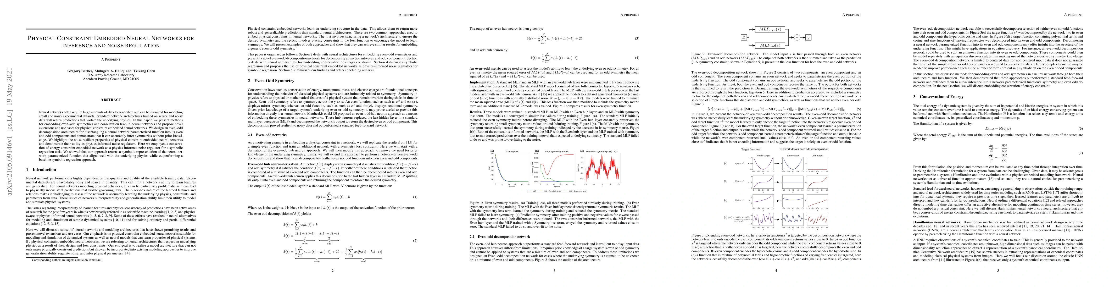 The research introduces methods for embedding even-odd symmetries and conservation laws in neural networks, specifically focusing on a conservation of energy constraint embedded network as a physics-informed noise regulator for symbolic regression tasks.
