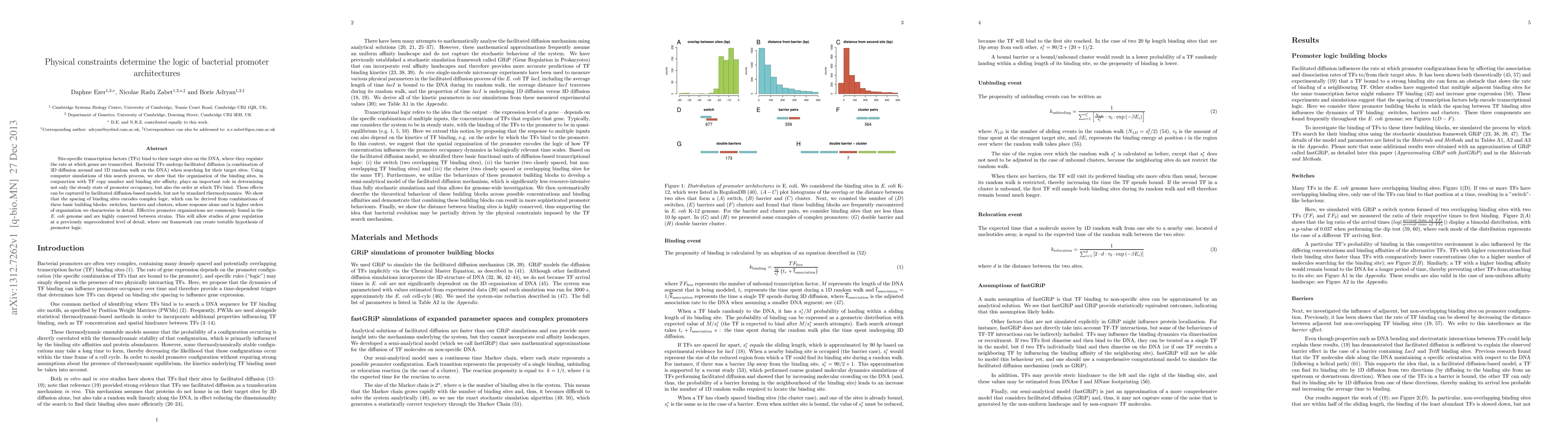 Site-specific transcription factors (TFs) bind to their target sites on the DNA, where they regulate the rate at which genes are transcribed. Bacterial TFs undergo facilitated diffusion (a combination of 3D diffusion around and 1D random walk on the DNA) when searching for their target sites. Using computer simulations of this search process, we show that the organisation of the binding sites, in conjunction with TF copy number and binding site affinity, plays an important role in determining not only the steady state of promoter occupancy, but also the order at which TFs bind. These effects can be captured by facilitated diffusion-based models, but not by standard thermodynamics. We show that the spacing of binding sites encodes complex logic, which can be derived from combinations of three basic building blocks: switches, barriers and clusters, whose response alone and in higher orders of organisation we characterise in detail. Effective promoter organizations are commonly found in the E. coli genome and are highly conserved between strains. This will allow studies of gene regulation at a previously unprecedented level of detail, where our framework can create testable hypothesis of promoter logic.
