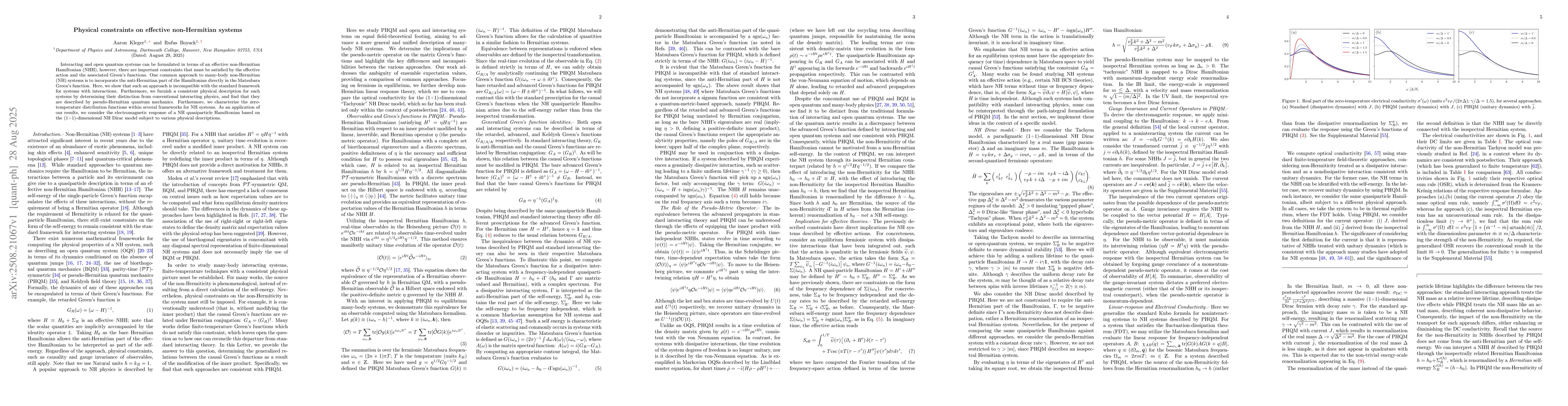 Interacting and open quantum systems can be formulated in terms of an effective non-Hermitian Hamiltonian (NHH), however, there are important constraints that must be satisfied by the effective action and the associated Green's functions. One common approach to many-body non-Hermitian (NH) systems is to incorporate the anti-Hermitian part of the Hamiltonian directly in the Matsubara Green's function. Here, we show that such an approach is incompatible with the standard framework for systems with interactions. Furthermore, we furnish a consistent physical description for such systems by determining their distinction from conventional interacting physics, and find that they are described by pseudo-Hermitian quantum mechanics. Furthermore, we characterize the zero-temperature distribution functions within several frameworks for NH systems. As an application of our results, we consider the electromagnetic response of a NH quasiparticle Hamiltonian based on the (1+1)-dimensional NH Dirac model subject to various physical descriptions.