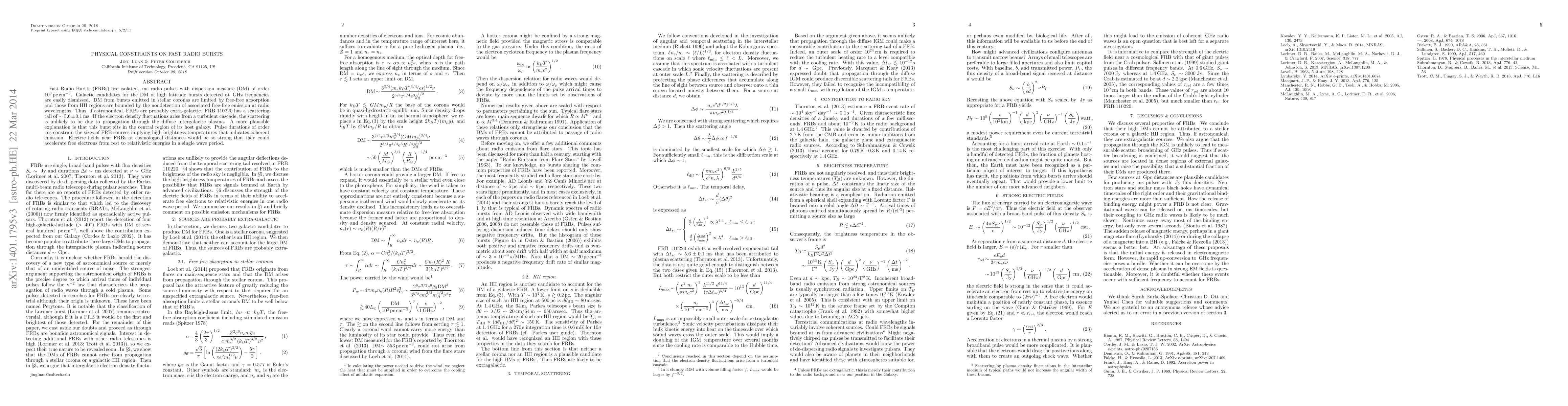 Fast Radio Bursts (FRBs) are isolated, $\ms$ radio pulses with dispersion measure (DM) of order $10^3\DMunit$. Galactic candidates for the DM of high latitude bursts detected at $\GHz$ frequencies are easily dismissed. DM from bursts emitted in stellar coronas are limited by free-free absorption and those from HII regions are bounded by the nondetection of associated free-free emission at radio wavelengths. Thus, if astronomical, FRBs are probably extra-galactic. FRB 110220 has a scattering tail of $\sim 5.6\pm 0.1 \ms$. If the electron density fluctuations arise from a turbulent cascade, the scattering is unlikely to be due to propagation through the diffuse intergalactic plasma. A more plausible explanation is that this burst sits in the central region of its host galaxy. Pulse durations of order $\ms$ constrain the sizes of FRB sources implying high brightness temperatures that indicates coherent emission. Electric fields near FRBs at cosmological distances would be so strong that they could accelerate free electrons from rest to relativistic energies in a single wave period.