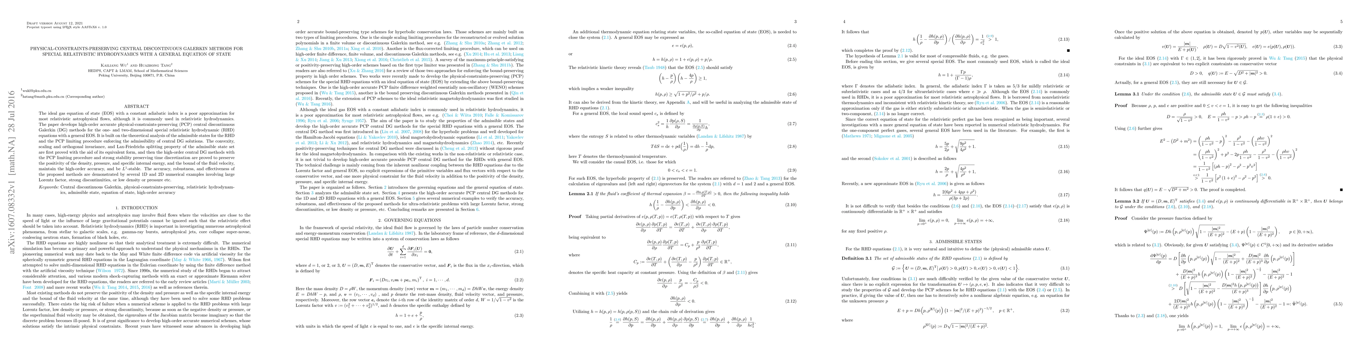 This paper develops high-order central discontinuous Galerkin methods that preserve physical constraints for special relativistic hydrodynamics with a general equation of state, ensuring positivity and bounds for density, pressure, and velocity, while maintaining high-order accuracy and stability. Numerical examples validate the methods' accuracy and robustness in complex scenarios.