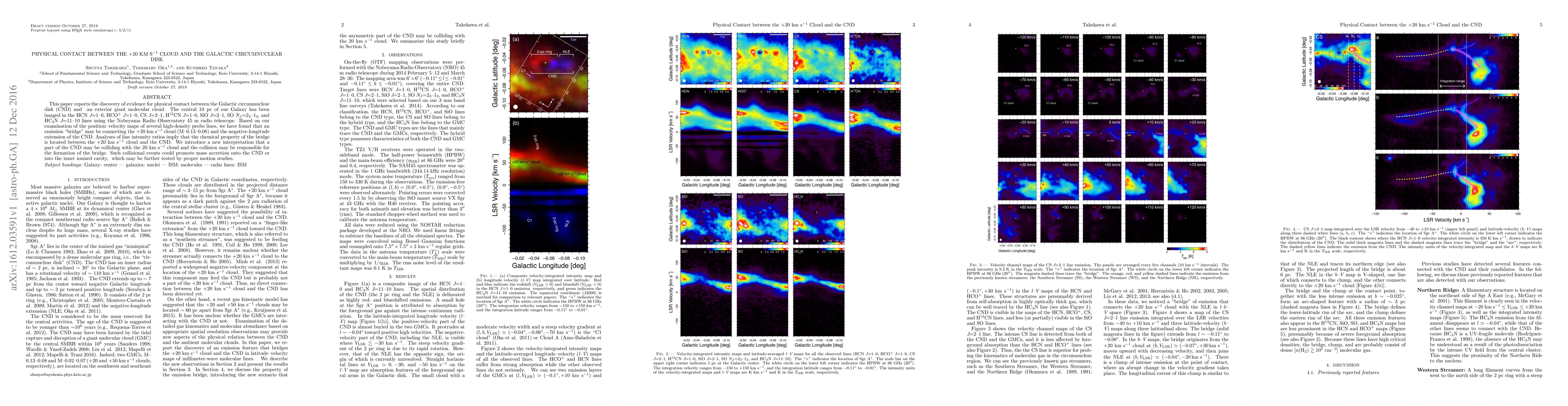 This paper reports the discovery of evidence for physical contact between the Galactic circumnuclear disk (CND) and an exterior giant molecular cloud. The central 10 pc of our Galaxy has been imaged in the HCN J=1-0, HCO+ J=1-0, CS J=2-1, H13CN J=1-0, SiO J=2-1, SO N_J=2_3-1_2, and HC3N J=11-10 lines using the Nobeyama Radio Observatory 45 m radio telescope. Based on our examination of the position-velocity maps of several high-density probe lines, we have found that an emission "bridge" may be connecting the +20 km/s cloud (M-0.13-0.08) and the negative-longitude extension of the CND. Analyses of line intensity ratios imply that the chemical property of the bridge is located between the +20 km/s cloud and the CND. We introduce a new interpretation that a part of the CND may be colliding with the 20 km/s cloud and the collision may be responsible for the formation of the bridge. Such collisional events could promote mass accretion onto the CND or into the inner ionized cavity, which may be further tested by proper motion studies.