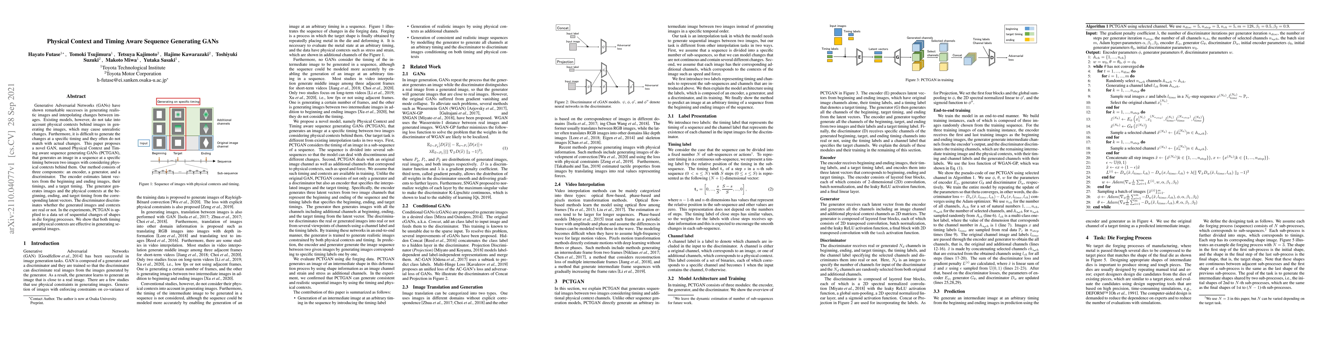 Generative Adversarial Networks (GANs) have shown remarkable successes in generating realistic images and interpolating changes between images. Existing models, however, do not take into account physical contexts behind images in generating the images, which may cause unrealistic changes. Furthermore, it is difficult to generate the changes at a specific timing and they often do not match with actual changes. This paper proposes a novel GAN, named Physical Context and Timing aware sequence generating GANs (PCTGAN), that generates an image in a sequence at a specific timing between two images with considering physical contexts behind them. Our method consists of three components: an encoder, a generator, and a discriminator. The encoder estimates latent vectors from the beginning and ending images, their timings, and a target timing. The generator generates images and the physical contexts at the beginning, ending, and target timing from the corresponding latent vectors. The discriminator discriminates whether the generated images and contexts are real or not. In the experiments, PCTGAN is applied to a data set of sequential changes of shapes in die forging processes. We show that both timing and physical contexts are effective in generating sequential images.