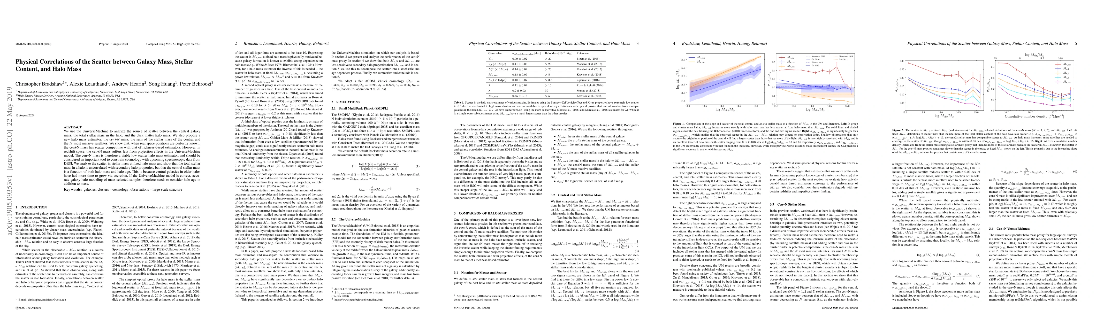 We use the UniverseMachine to analyze the source of scatter between the central galaxy mass, the total stellar mass in the halo, and the dark matter halo mass. We also propose a new halo mass estimator, the cen+N mass: the sum of the stellar mass of the central and the N most massive satellites. We show that, when real space positions are perfectly known, the cen+N mass has scatter competitive with that of richness-based estimators. However, in redshift space, the cen+N mass suffers less from projection effects in the UniverseMachine model. The cen+N mass is therefore a viable low scatter halo mass estimator, and should be considered an important tool to constrain cosmology with upcoming spectroscopic data from DESI. We analyze the scatter in stellar mass at fixed halo mass and show that the total stellar mass in a halo is uncorrelated with secondary halo properties, but that the central stellar mass is a function of both halo mass and halo age. This is because central galaxies in older halos have had more time to grow via accretion. If the UniverseMachine model is correct, accurate galaxy-halo modeling of mass selected samples therefore needs to consider halo age in addition to mass.