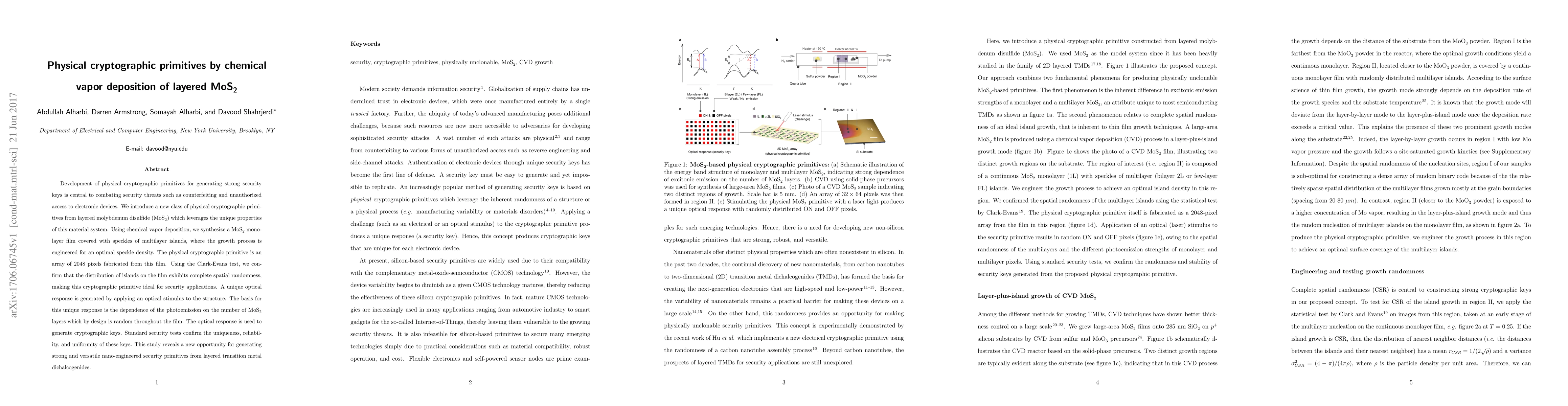 This paper develops physical cryptographic primitives using chemical vapor deposition of layered MoS2, leveraging the material's unique properties for generating strong security keys. The study fabricates a random speckled MoS2 monolayer film, confirming its randomness and using its unique optical response to create secure cryptographic keys.