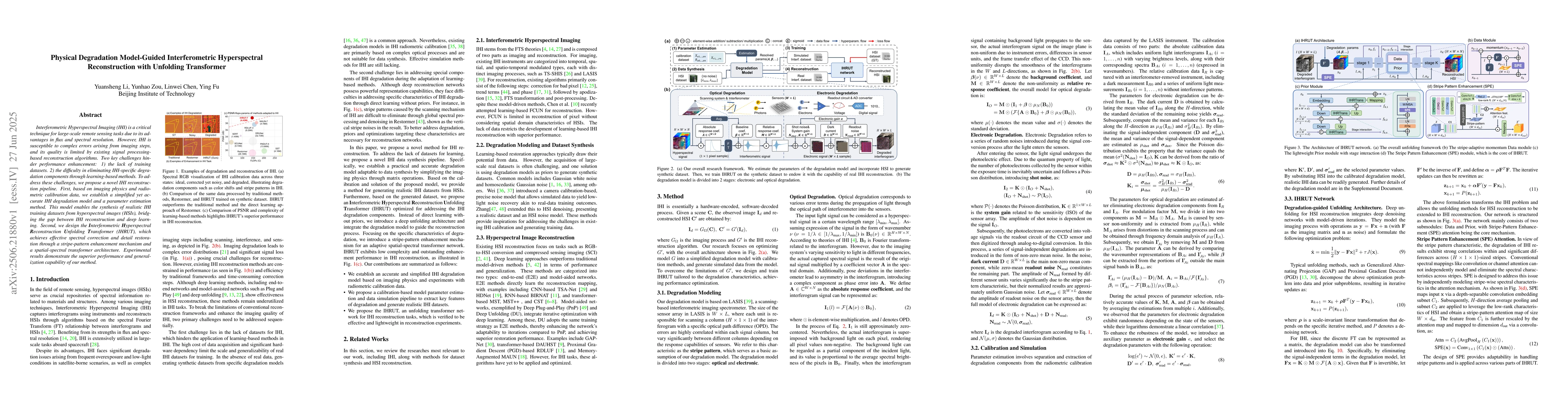 Interferometric Hyperspectral Imaging (IHI) is a critical technique for large-scale remote sensing tasks due to its advantages in flux and spectral resolution. However, IHI is susceptible to complex errors arising from imaging steps, and its quality is limited by existing signal processing-based reconstruction algorithms. Two key challenges hinder performance enhancement: 1) the lack of training datasets. 2) the difficulty in eliminating IHI-specific degradation components through learning-based methods. To address these challenges, we propose a novel IHI reconstruction pipeline. First, based on imaging physics and radiometric calibration data, we establish a simplified yet accurate IHI degradation model and a parameter estimation method. This model enables the synthesis of realistic IHI training datasets from hyperspectral images (HSIs), bridging the gap between IHI reconstruction and deep learning. Second, we design the Interferometric Hyperspectral Reconstruction Unfolding Transformer (IHRUT), which achieves effective spectral correction and detail restoration through a stripe-pattern enhancement mechanism and a spatial-spectral transformer architecture. Experimental results demonstrate the superior performance and generalization capability of our method.