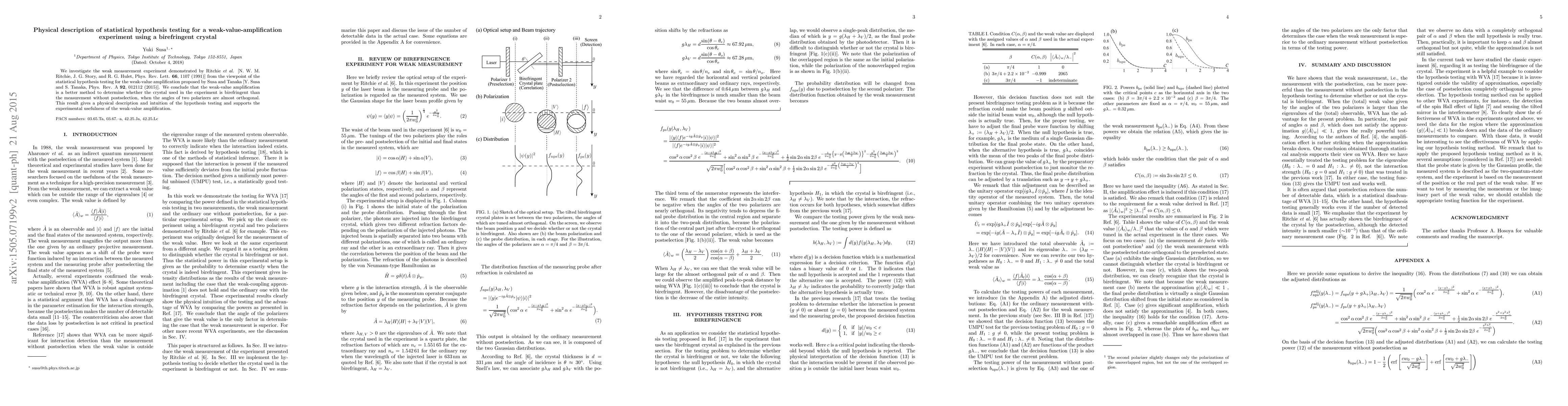 We investigate the weak measurement experiment demonstrated by Ritchie et al. [N. W. M. Ritchie, J. G. Story, and R. G. Hulet, Phys. Rev. Lett. 66, 1107 (1991)] from the viewpoint of the statistical hypothesis testing for the weak-value amplification proposed by Susa and Tanaka [Y. Susa and S. Tanaka, Phys. Rev. A 92, 012112 (2015)]. We conclude that the weak-value amplification is a better method to determine whether the crystal used in the experiment is birefringent than the measurement without postselection, when the angles of two polarizers are almost orthogonal. This result gives a physical description and intuition of the hypothesis testing and supports the experimental usefulness of the weak-value amplification.