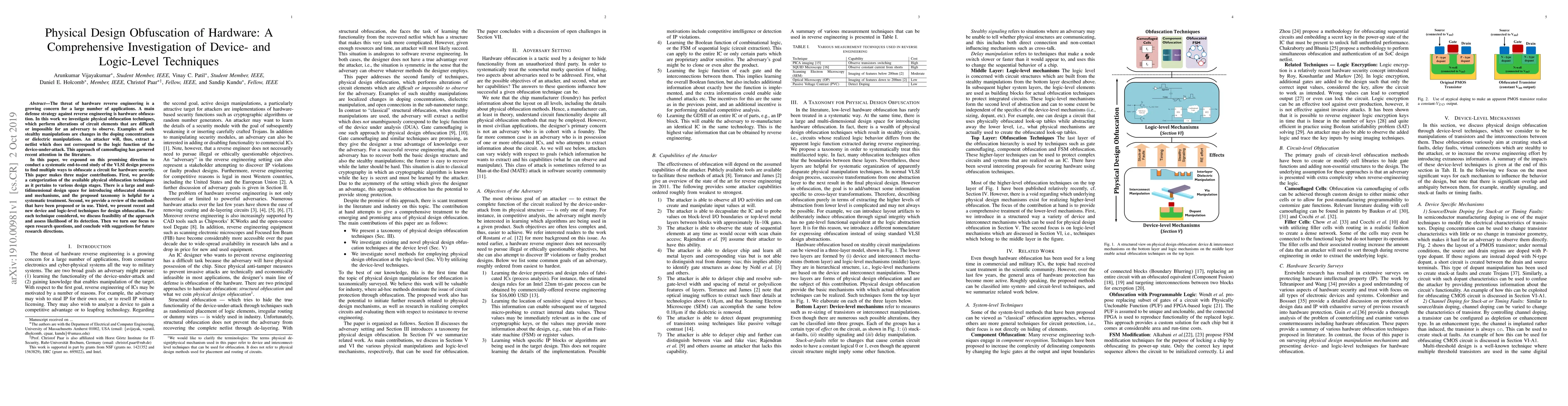 This paper categorizes and reviews physical obfuscation techniques for hardware security, focusing on device- and logic-level alterations that make reverse engineering difficult. It provides a taxonomy for obfuscation methods, assesses their feasibility and detectability, and proposes new techniques for VLSI design obfuscation.