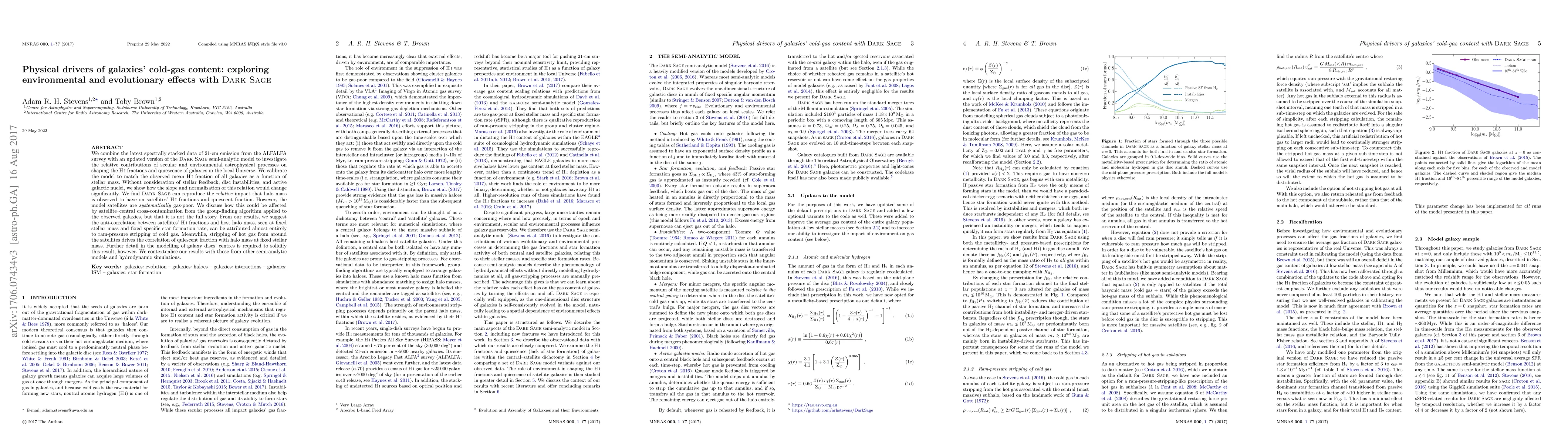 This paper combines spectrally stacked data from the ALFALFA survey with the DARK SAGE semi-analytic model to explore how environmental and evolutionary processes affect galaxies' cold-gas content. The study finds that ram-pressure stripping is the primary driver of the anti-correlation between satellite galaxies' HI fractions and host halo mass, while stripping of hot gas correlates quiescent fraction with halo mass.