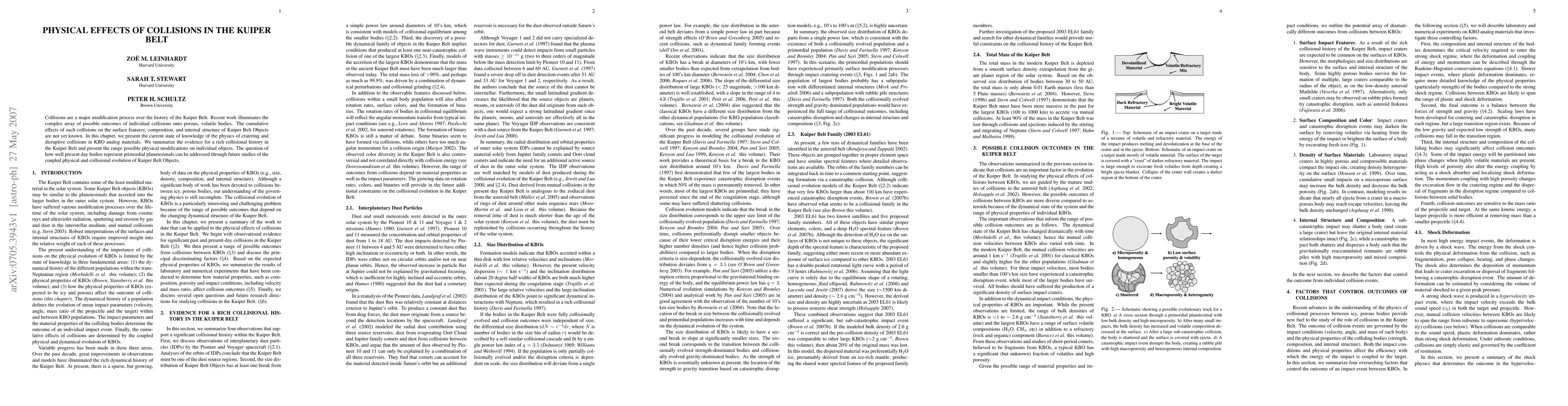 Collisions are a major modification process over the history of the Kuiper Belt. Recent work illuminates the complex array of possible outcomes of individual collisions onto porous, volatile bodies. The cumulative effects of such collisions on the surface features, composition, and internal structure of Kuiper Belt Objects are not yet known. In this chapter, we present the current state of knowledge of the physics of cratering and disruptive collisions in KBO analog materials. We summarize the evidence for a rich collisional history in the Kuiper Belt and present the range possible physical modifications on individual objects. The question of how well present day bodies represent primordial planetesimals can be addressed through future studies of the coupled physical and collisional evolution of Kuiper Belt Objects.