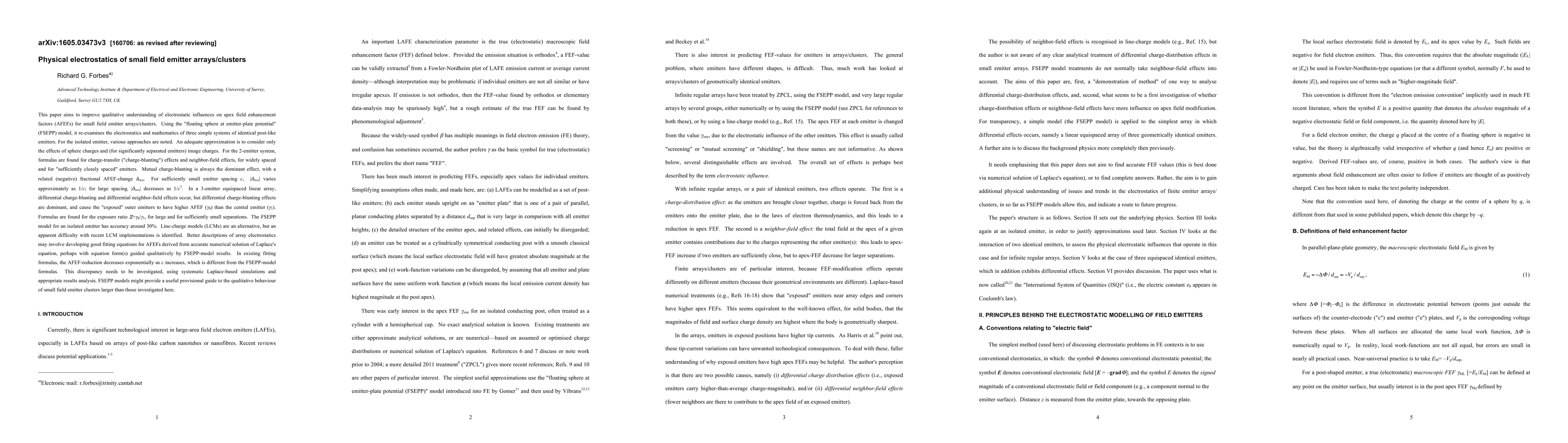 This paper improves understanding of electrostatic influences on apex field enhancement factors (AFEFs) for small field emitter arrays. Using the "floating sphere at emitter-plate potential" (FSEPP) model, it re-examines the electrostatics and mathematics of three simple systems of identical post-like emitters. For the isolated emitter, various approaches are noted. On need consider only the effects of sphere charges and (for separated emitters) image charges. For the 2-emitter system, formulas are found for "charge-blunting" and "neighbour-field" effects, for widely spaced and "sufficiently closely spaced" emitters. Mutual charge-blunting is always dominant, with a related (negative) fractional AFEF-change {\delta}_two. For sufficiently small emitter spacing c, |{\delta}_two| varies as 1/c; for large spacing, |{\delta}_two| decreases as 1/c^3. In a 3-emitter linear array, differential charge-blunting and differential neighbor-field effects occur, but the former are dominant, and cause the "exposed" outer emitters to have higher AFEF ({\gamma}_0) than the central emitter ({\gamma}_1). Formulas are found for the exposure ratio {\Xi}={\gamma}_0/{\gamma}_1, for large and for sufficiently small separations. The FSEPP model for an isolated emitter has accuracy around 30%. Line-charge models (LCMs) are an alternative, but an apparent difficulty with recent LCM models is identified. Better descriptions of array electrostatics may involve developing good fitting equations for AFEFs derived from accurate numerical solution of Laplace's equation, perhaps with equation form(s) guided qualitatively by FSEPP-model results. In existing fitting formulas, the AFEF-reduction decreases exponentially as c increases, which differs from FSEPP-model formulas. FSEPP models might provide a useful guide to the qualitative behaviour of small field emitter clusters larger than those investigated.