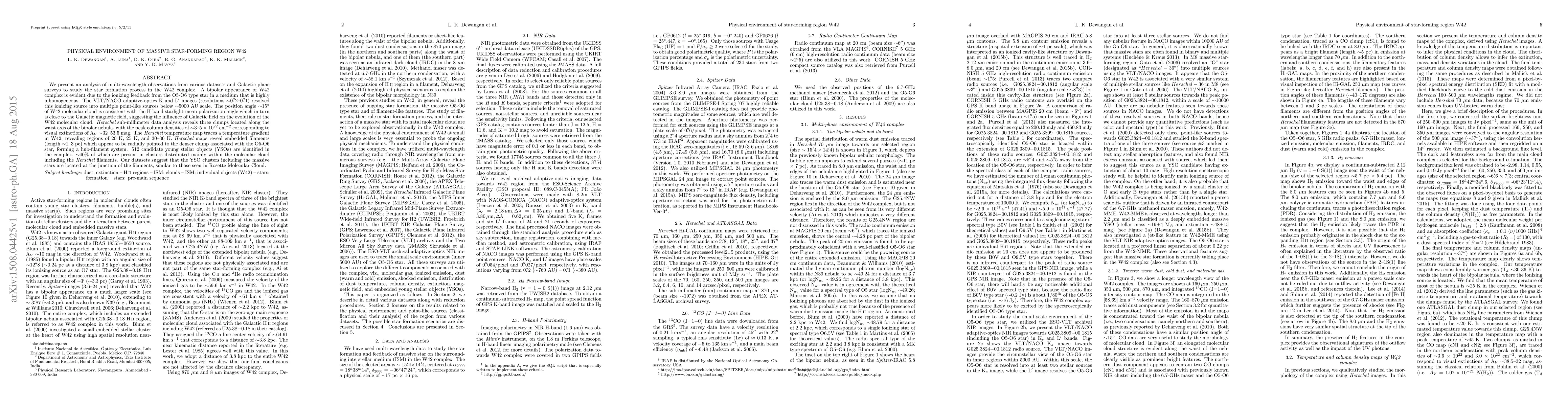 We present an analysis of multi-wavelength observations from various datasets and Galactic plane surveys to study the star formation process in the W42 complex. A bipolar appearance of W42 complex is evident due to the ionizing feedback from the O5-O6 type star in a medium that is highly inhomogeneous. The VLT/NACO adaptive-optics K and L' images (resolutions ~0".2-0".1) resolved this ionizing source into multiple point-like sources below ~5000 AU scale. The position angle ~15 deg of W42 molecular cloud is consistent with the H-band starlight mean polarization angle which in turn is close to the Galactic magnetic field, suggesting the influence of Galactic field on the evolution of the W42 molecular cloud. Herschel sub-millimeter data analysis reveals three clumps located along the waist axis of the bipolar nebula, with the peak column densities of ~3-5 x10^{22} cm^{-2} corresponding to visual extinctions of AV ~32-53.5 mag. The Herschel temperature map traces a temperature gradient in W42, revealing regions of 20 K, 25 K, and 30-36 K. Herschel maps reveal embedded filaments (length ~1-3 pc) which appear to be radially pointed to the denser clump associated with the O5-O6 star, forming a hub-filament system. 512 candidate young stellar objects (YSOs) are identified in the complex, ~40% of which are present in clusters distributed mainly within the molecular cloud including the Herschel filaments. Our datasets suggest that the YSO clusters including the massive stars are located at the junction of the filaments, similar to those seen in Rosette Molecular Cloud.